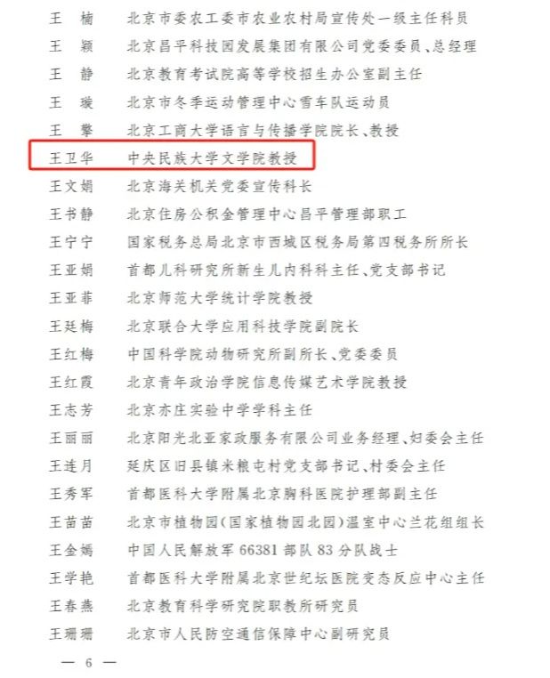 新闻网讯 近日,北京市妇女联合会、北京市总工会、北京市人力资源和社会保障局联合发布表彰决定。我校文学院王卫华教授荣获2024年“北京市三八红旗奖章”荣誉称号。
