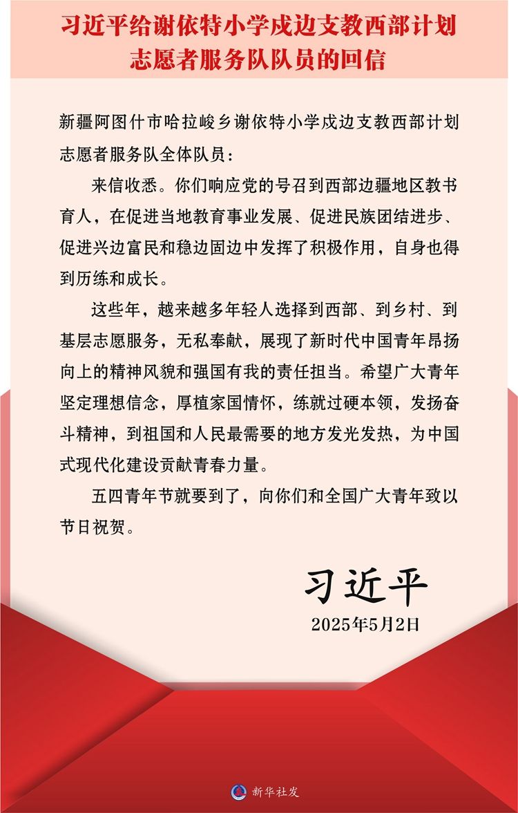 新闻网讯 在五四青年节到来之际,中共中央总书记、国家主席、中央军委主席习近平给新疆克孜勒苏柯尔克孜自治州阿图什市哈拉峻乡谢依特小学戍边支教西部计划志愿者服务队全体队员回信,向全国广大青年致以节日祝贺并提出殷切期望。希望广大青年坚定理想信念,厚植家国情怀,练就过硬本领,发扬奋斗精神,到祖国和人民最需要的地方发光发热,为中国式现代化建设贡献青春力量。总书记的回信在ag视讯广大青年中引发热烈反响。