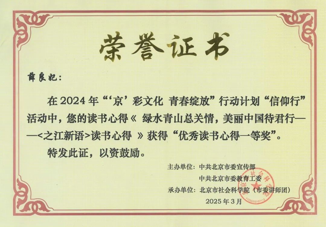 新闻网讯 近日,由中共北京市委宣传部、中共北京市委教育工委主办,北京市社会科学院(市委讲师团)承办的2024年“‘京’彩文化 青春绽放”行动计划“信仰行”活动评选结果正式公布。ag真人试玩文学院2022级本科生薛良妃的读书心得《绿水青山总关情,美丽中国待君行——<之江新语>读书心得》从众多参赛作品中脱颖而出,获得“优秀读书心得一等奖”。