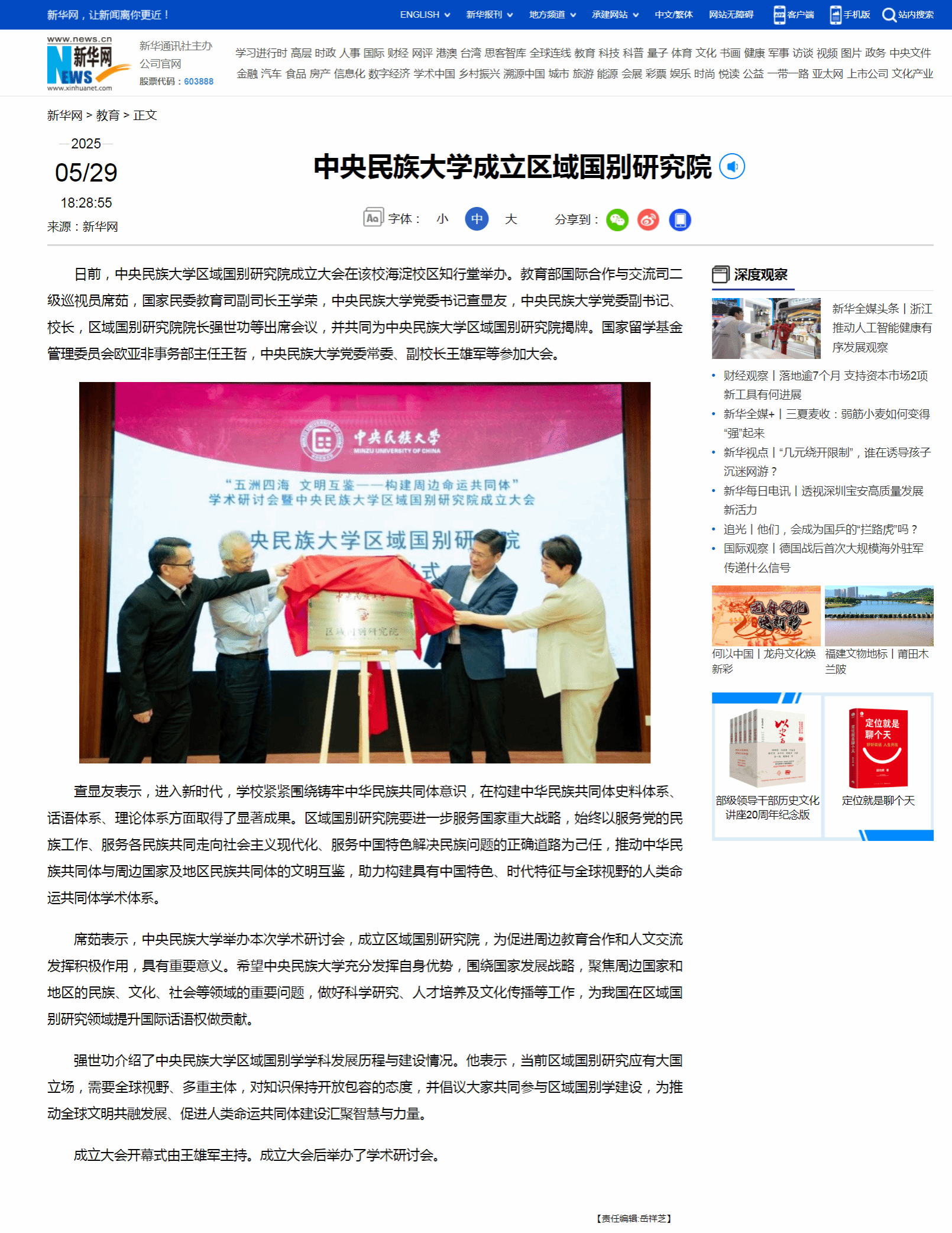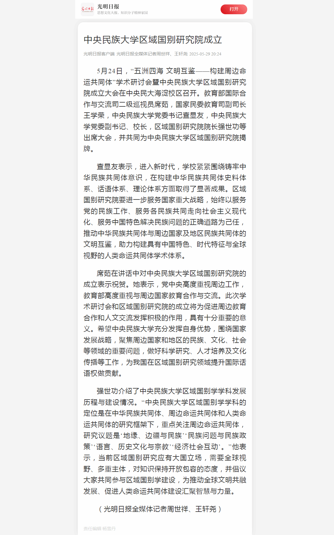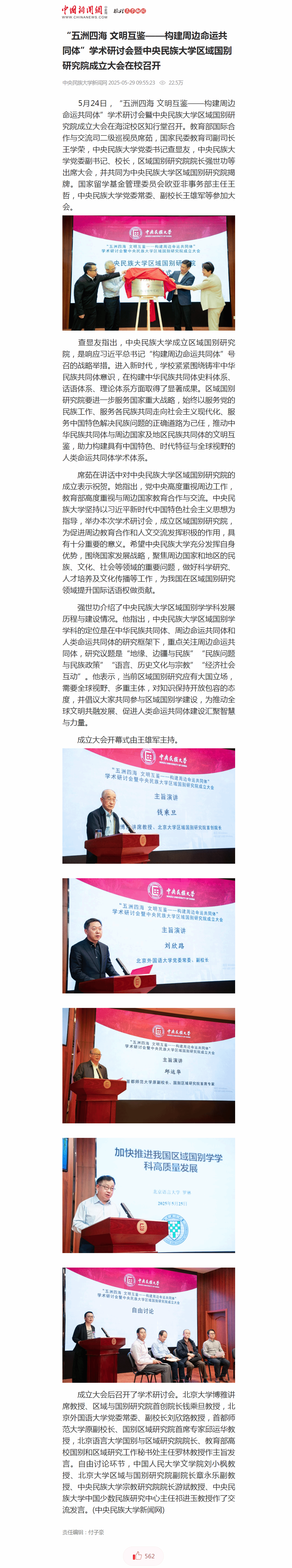新闻网讯 5月24日,“五洲四海 文明互鉴——构建周边命运共同体”学术研讨会暨ag真人试玩区域国别研究院成立大会在海淀校区知行堂召开,ag真人试玩成立区域国别研究院,是响应习近平总书记“构建周边命运共同体”号召的战略举措。学校官方网站、新闻网头条报道研究院成立新闻,文章一经发布,获得了新华网、光明日报、中国新闻网的纷纷关注和转载报道。