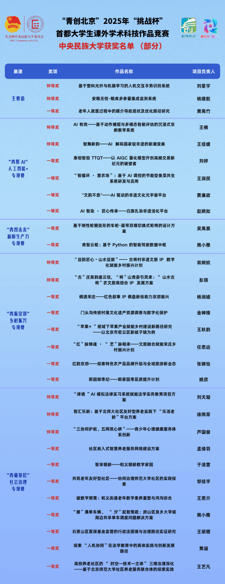 新闻网讯 5月29日,2025年“挑战杯”首都大学生课外学术科技作品竞赛在北京信息科技大学落下帷幕。我校参赛团队共获得特等奖9项、一等奖21项、二等奖50项、三等奖64项,主体赛获奖率100%,再捧首都“优胜杯”!