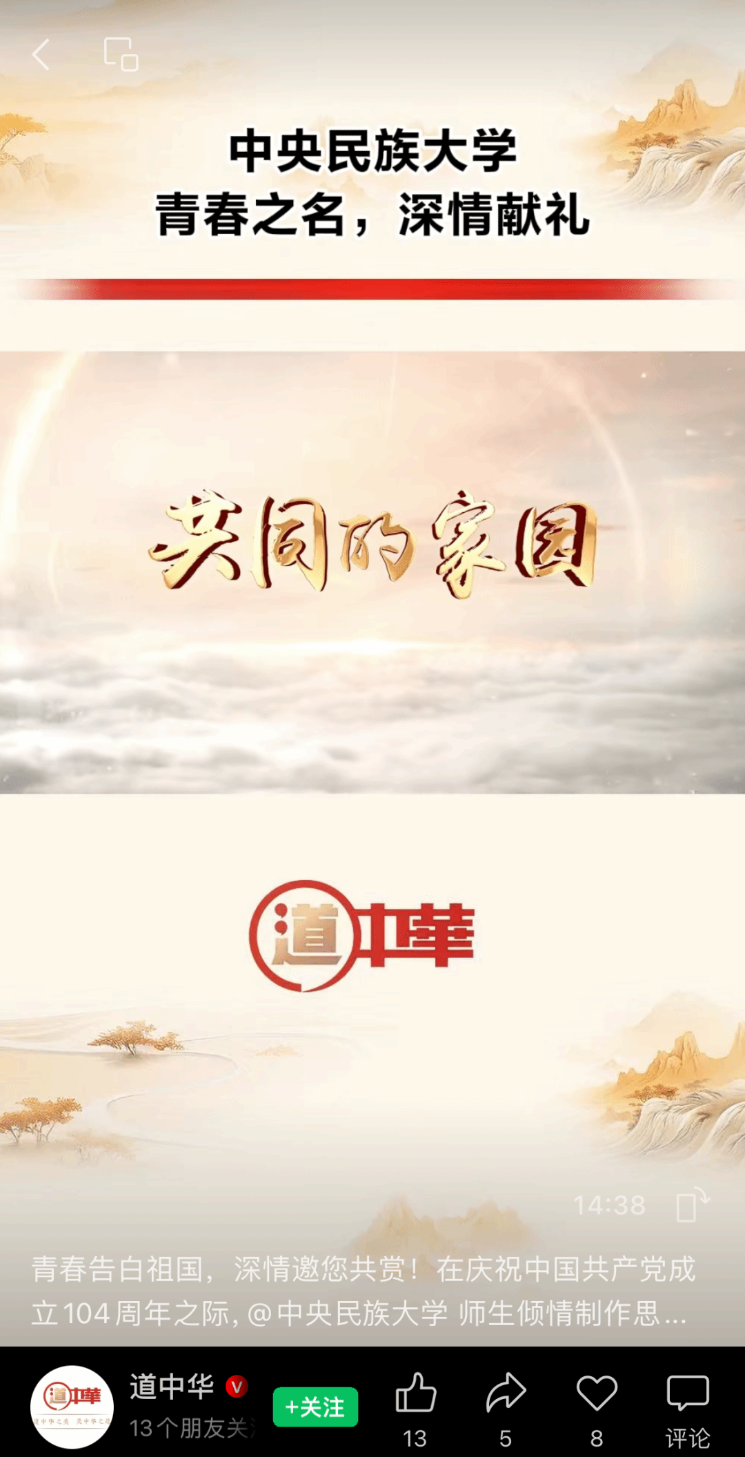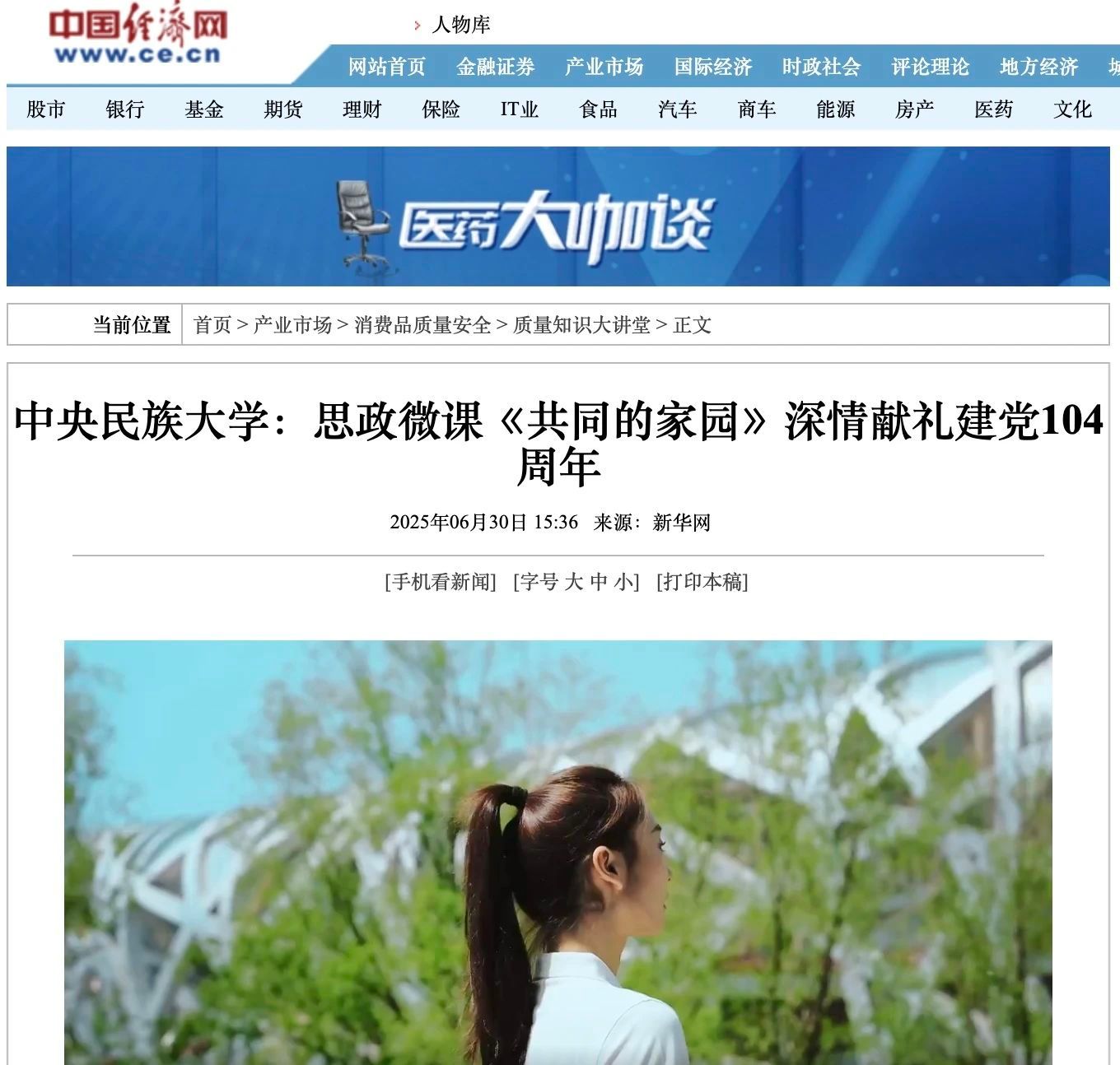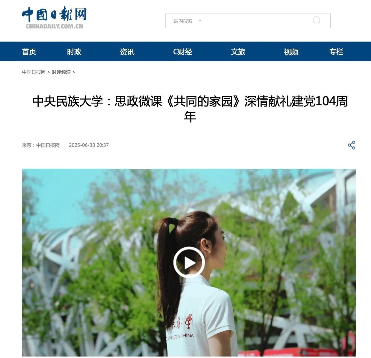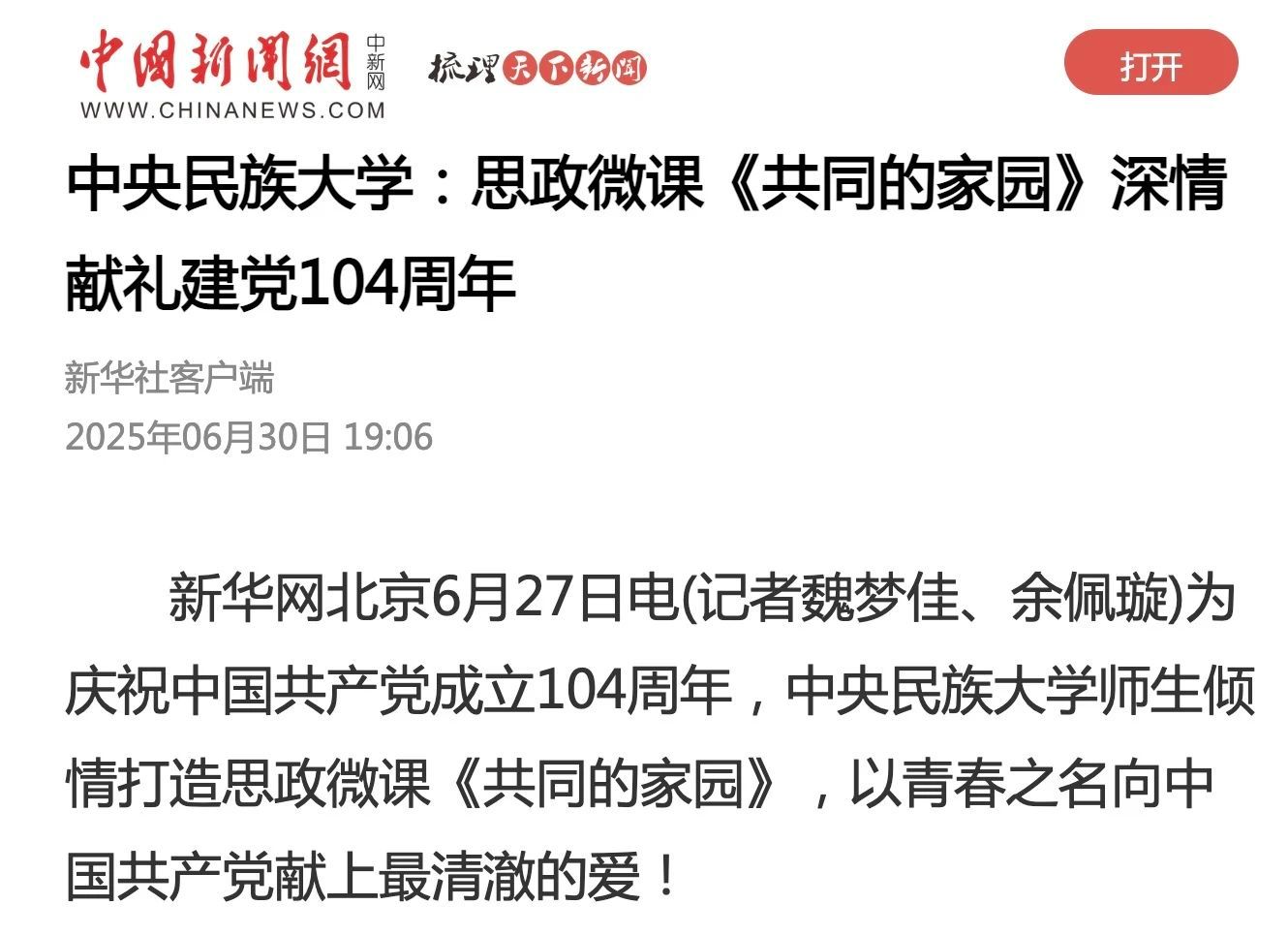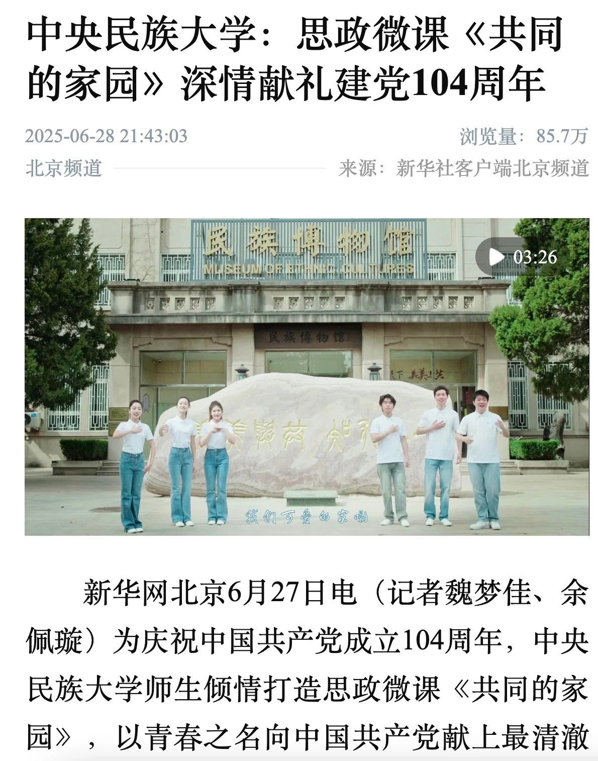 新闻网讯 为庆祝中国共产党成立104周年,ag真人试玩师生倾情打造思政微课《共同的家园》,以青春之名向中国共产党献上最清澈的爱!这堂思政微课被“道中华”视频号,新华网、新华社客户端,人民网视频号、抖音号、快手号、小红书号,中国新闻网,中国日报网,中国青年报视频号,中国经济网,环球时报环视频快手号,北京日报视频号、微博号,北京晚报视频号、微博号等媒体平台关注报道。