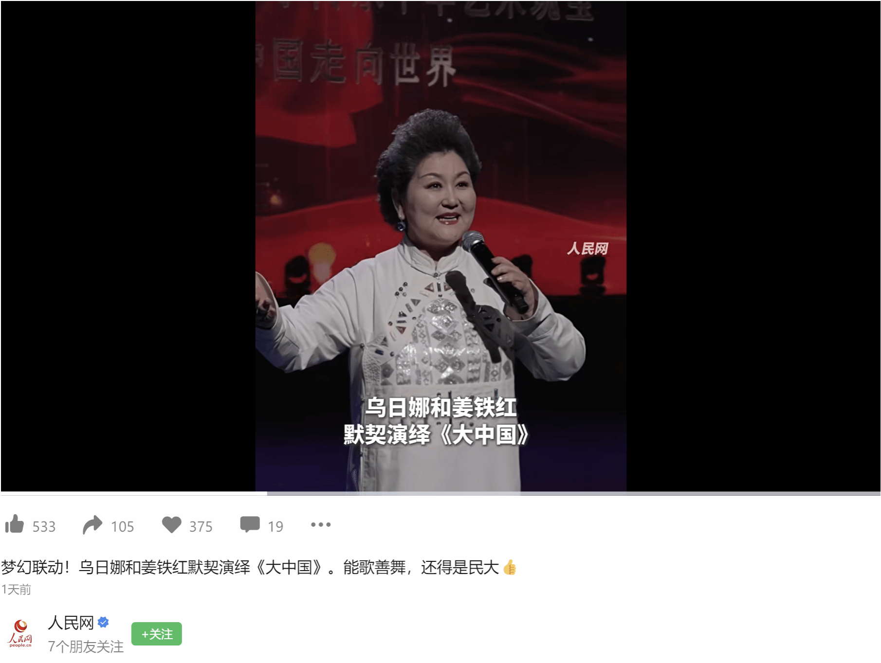 乌日娜老师和姜铁红院长梦幻联动演出《大中国》