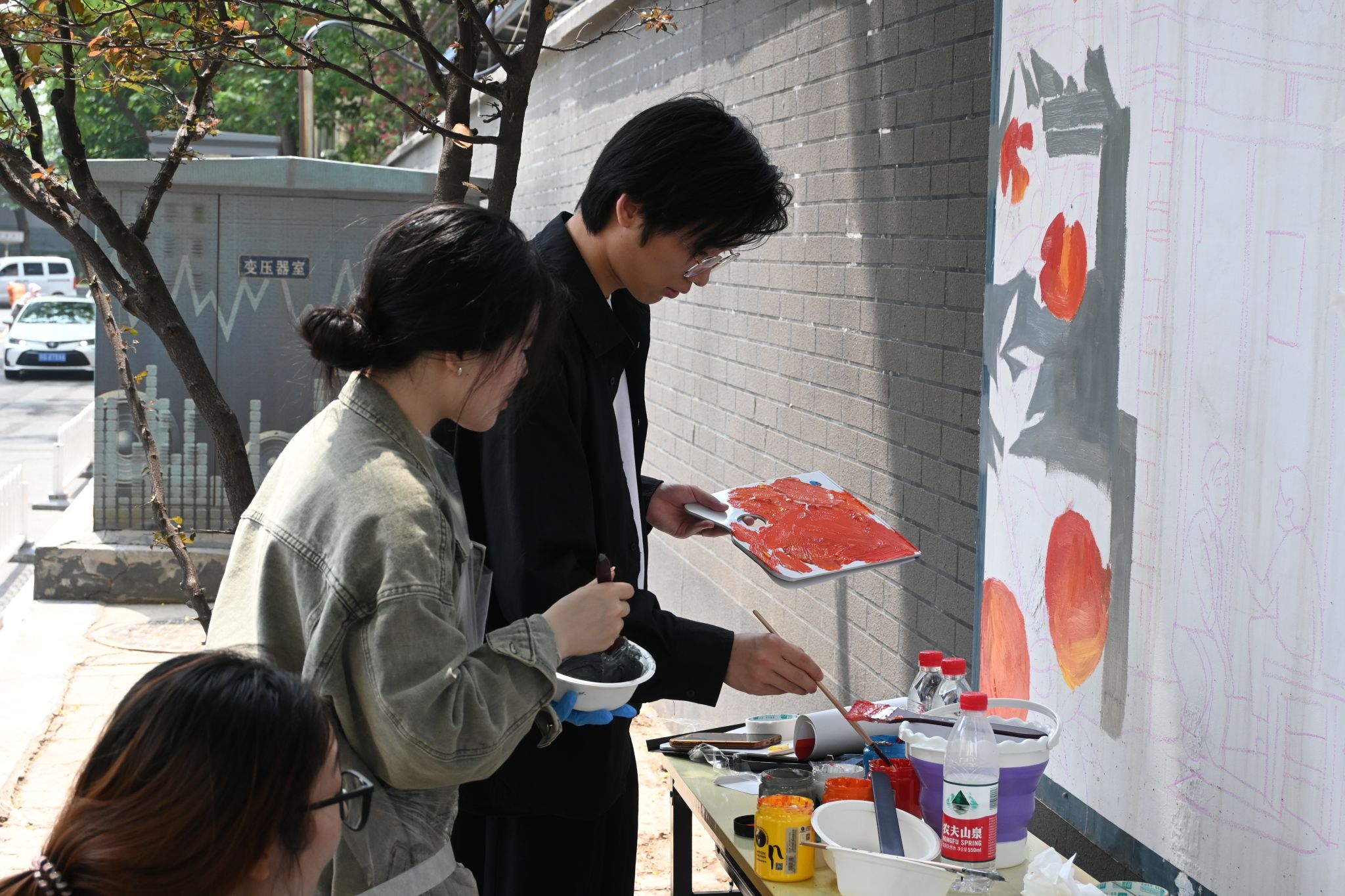 学生志愿者参与主题墙绘