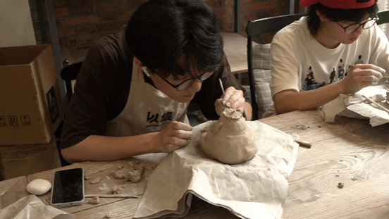 老师带领同学们在下乡实践中体验泥塑和拉坯传统手工技艺