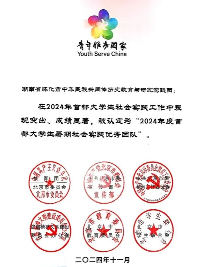“三交”史实践团荣获“2024年度首都大学生暑期社会实践优秀团队”