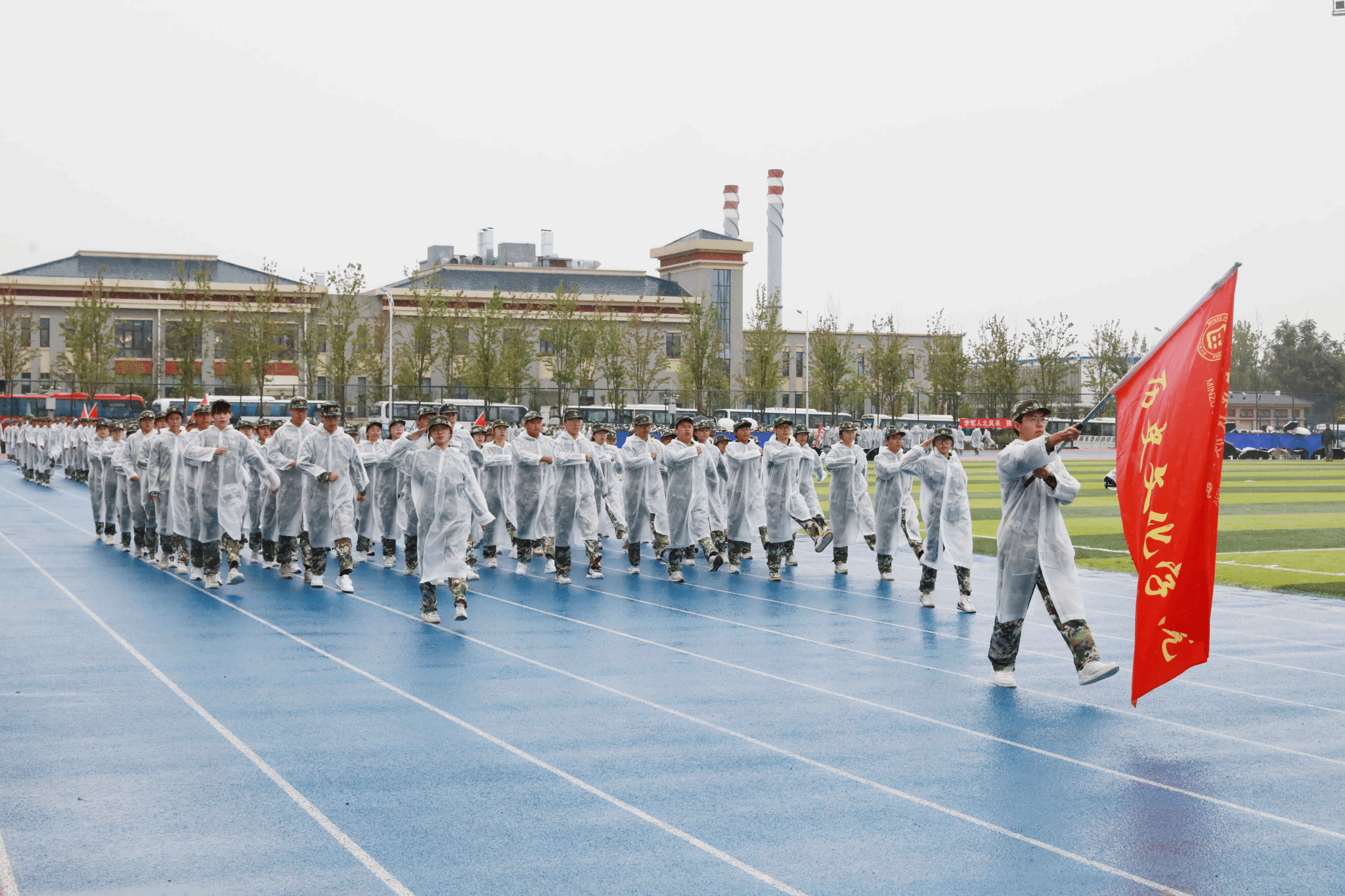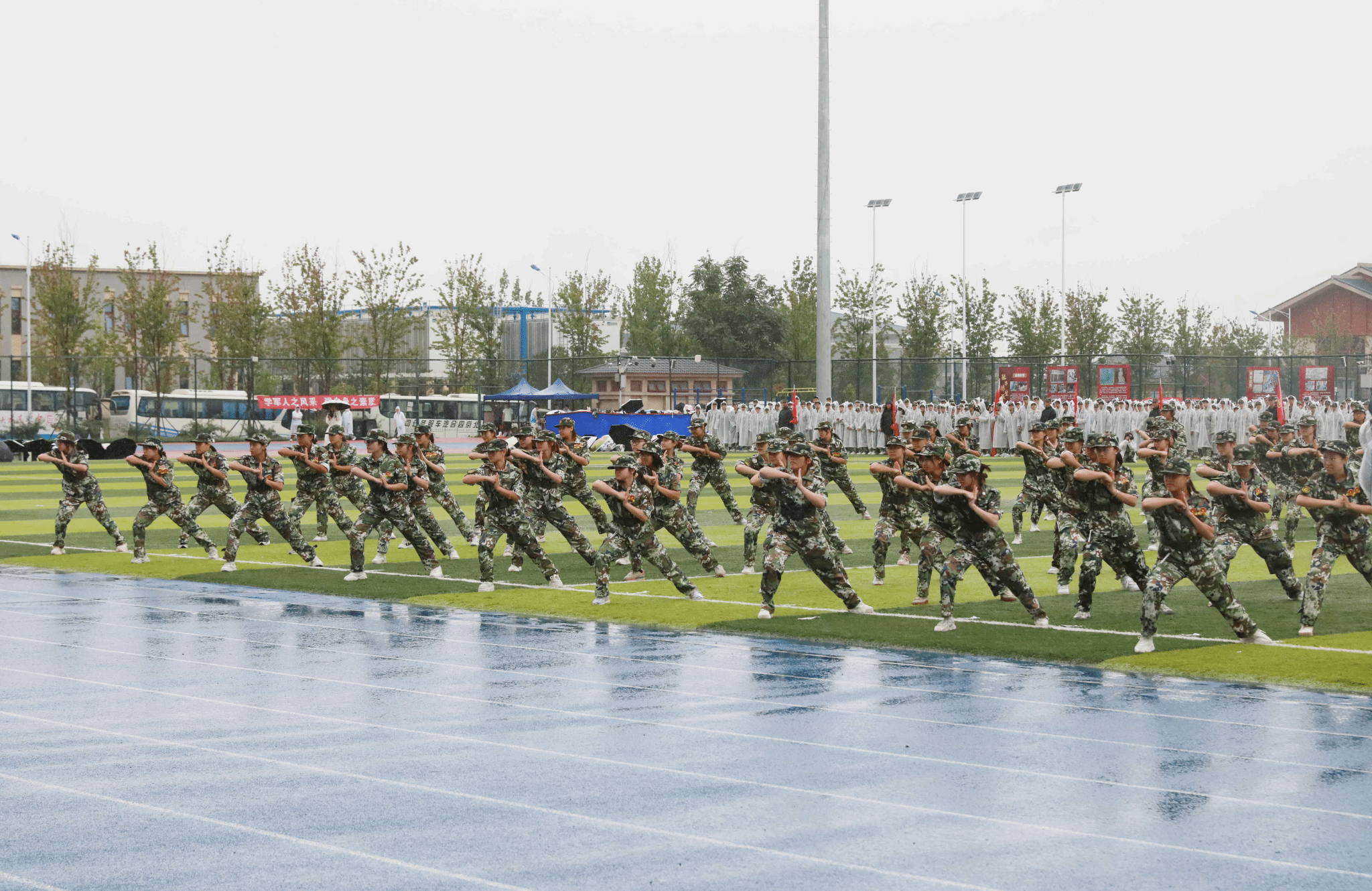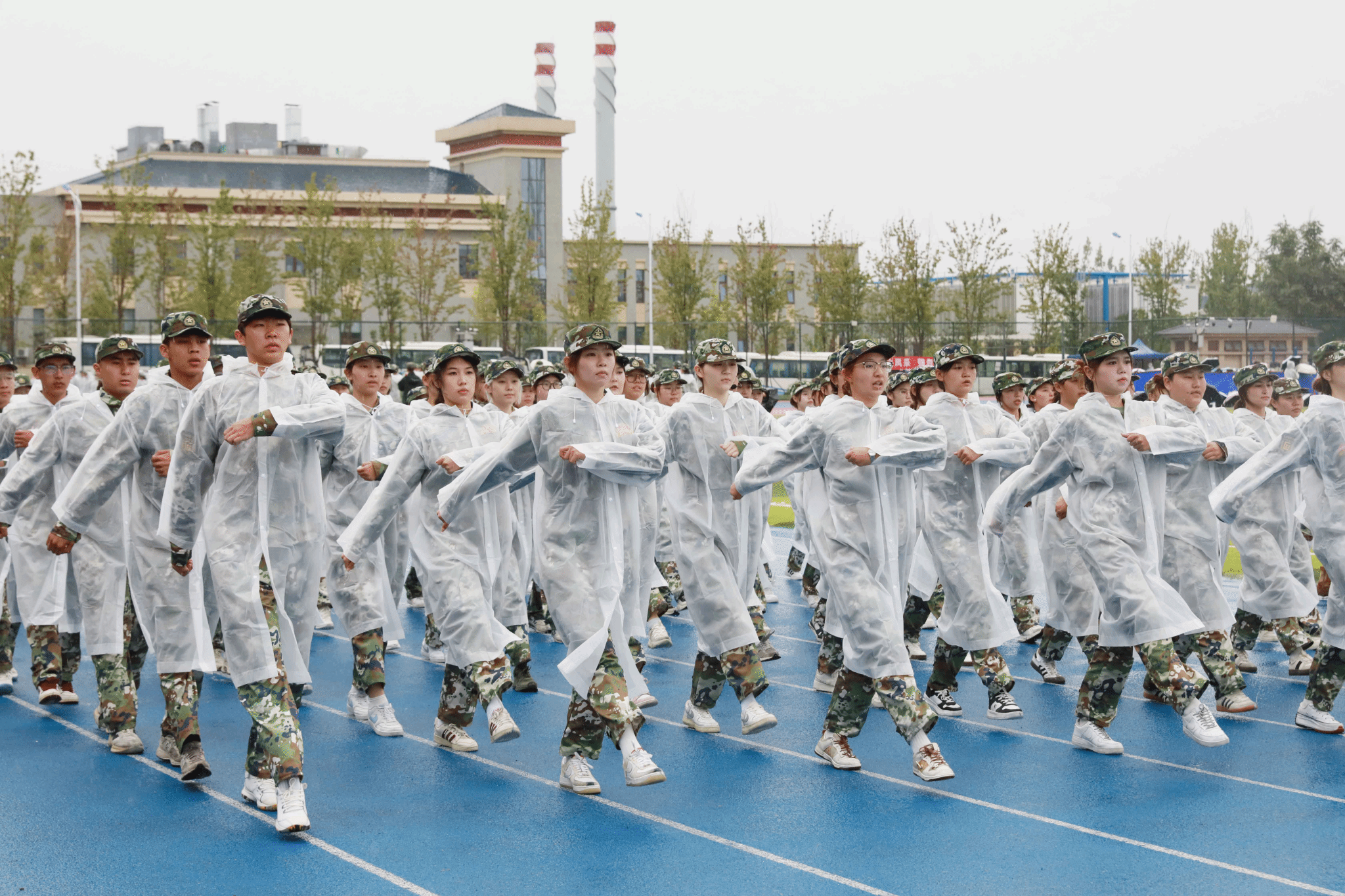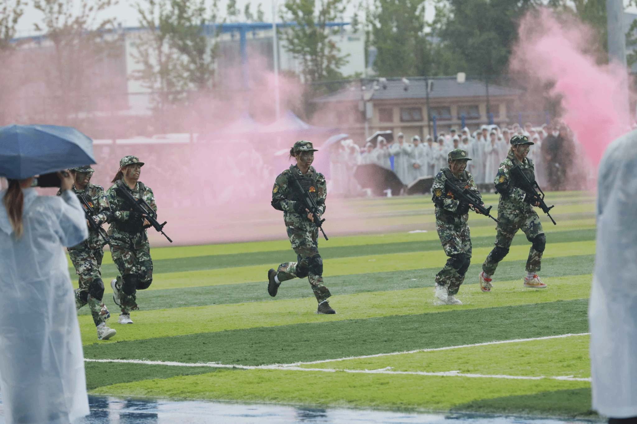 绵绵细雨中,全体参训学生以学院为单位进行了分列式表演。伴随着《分列式进行曲》,20个方阵步伐铿锵、英姿飒爽,自信的目光、整齐的步伐,彰显着青春朝气与坚韧意志。