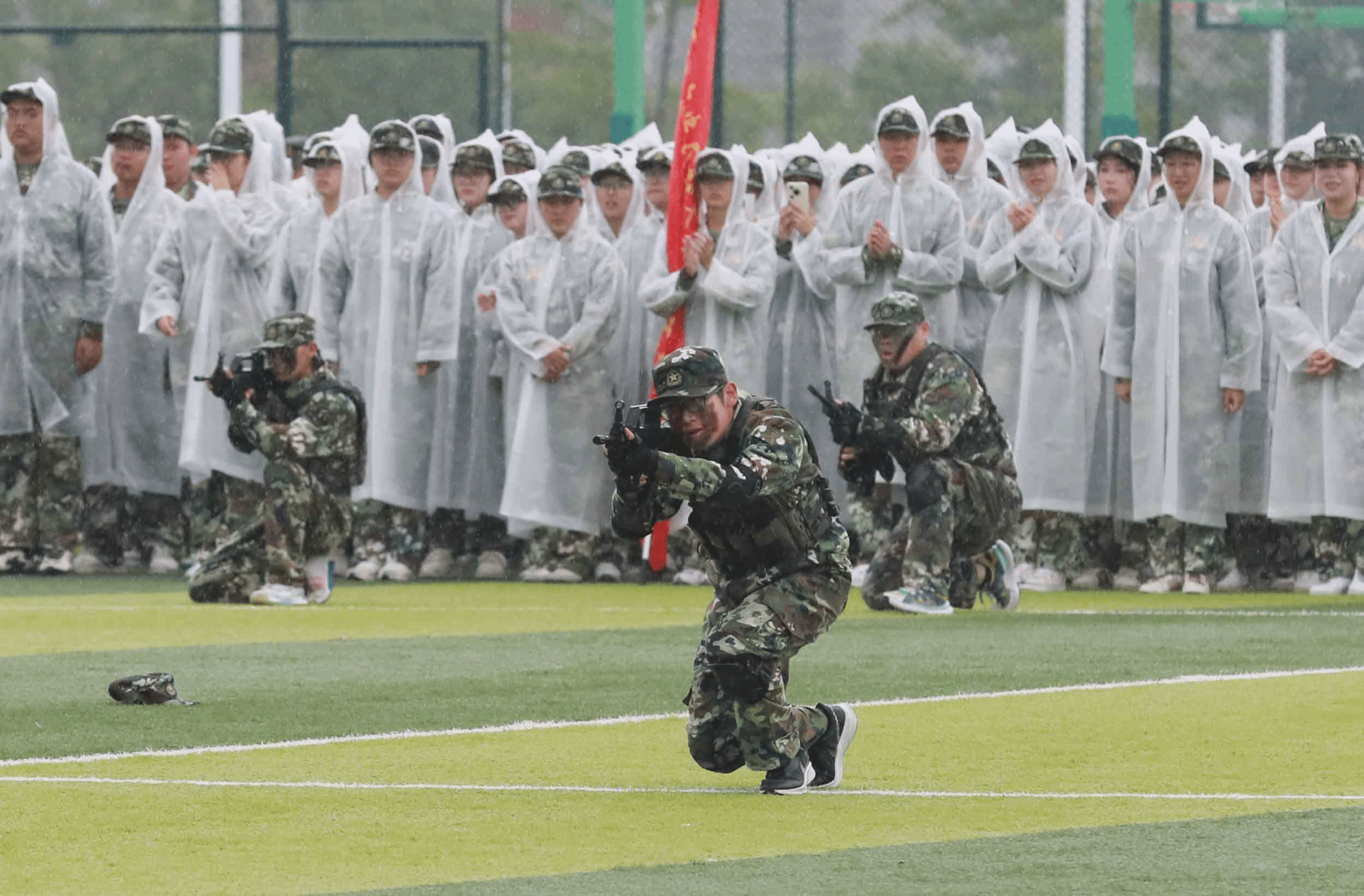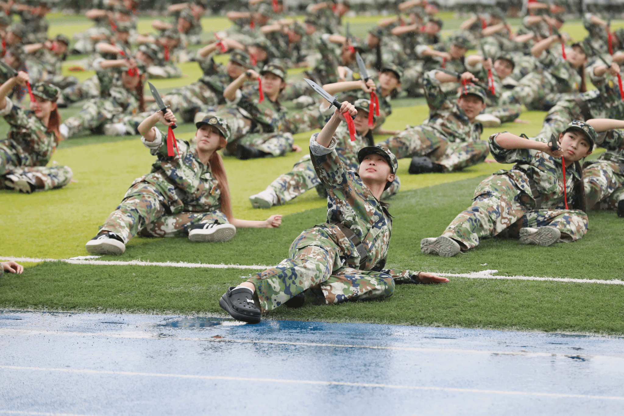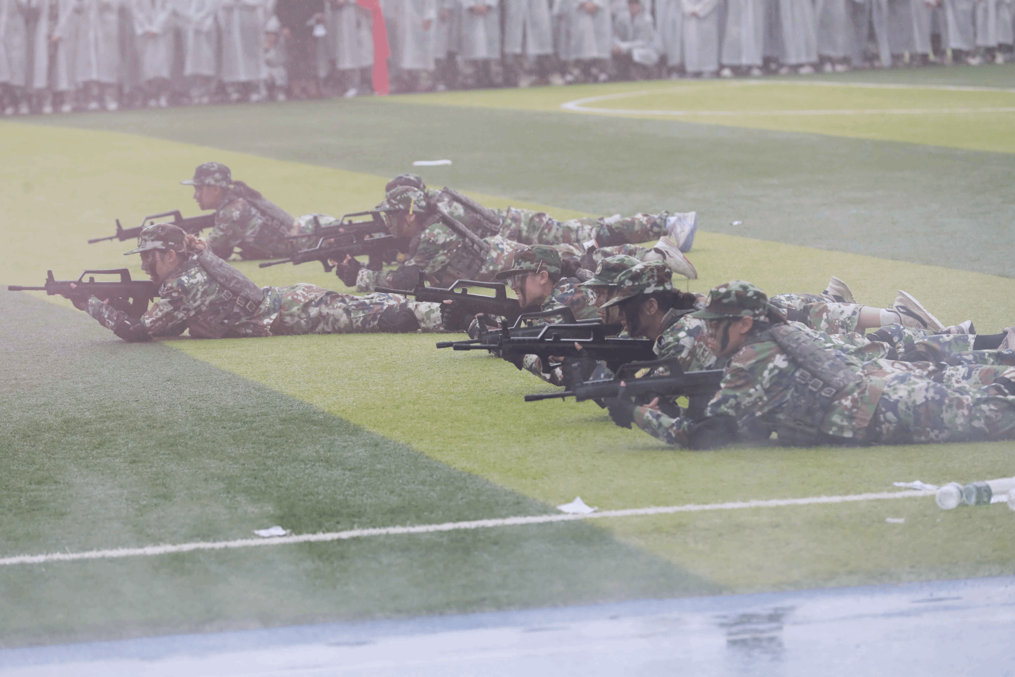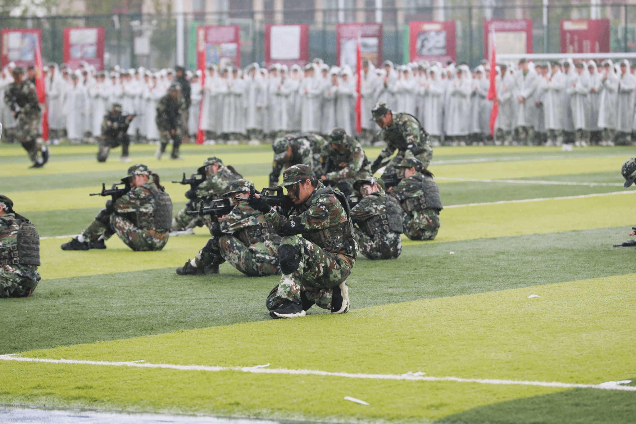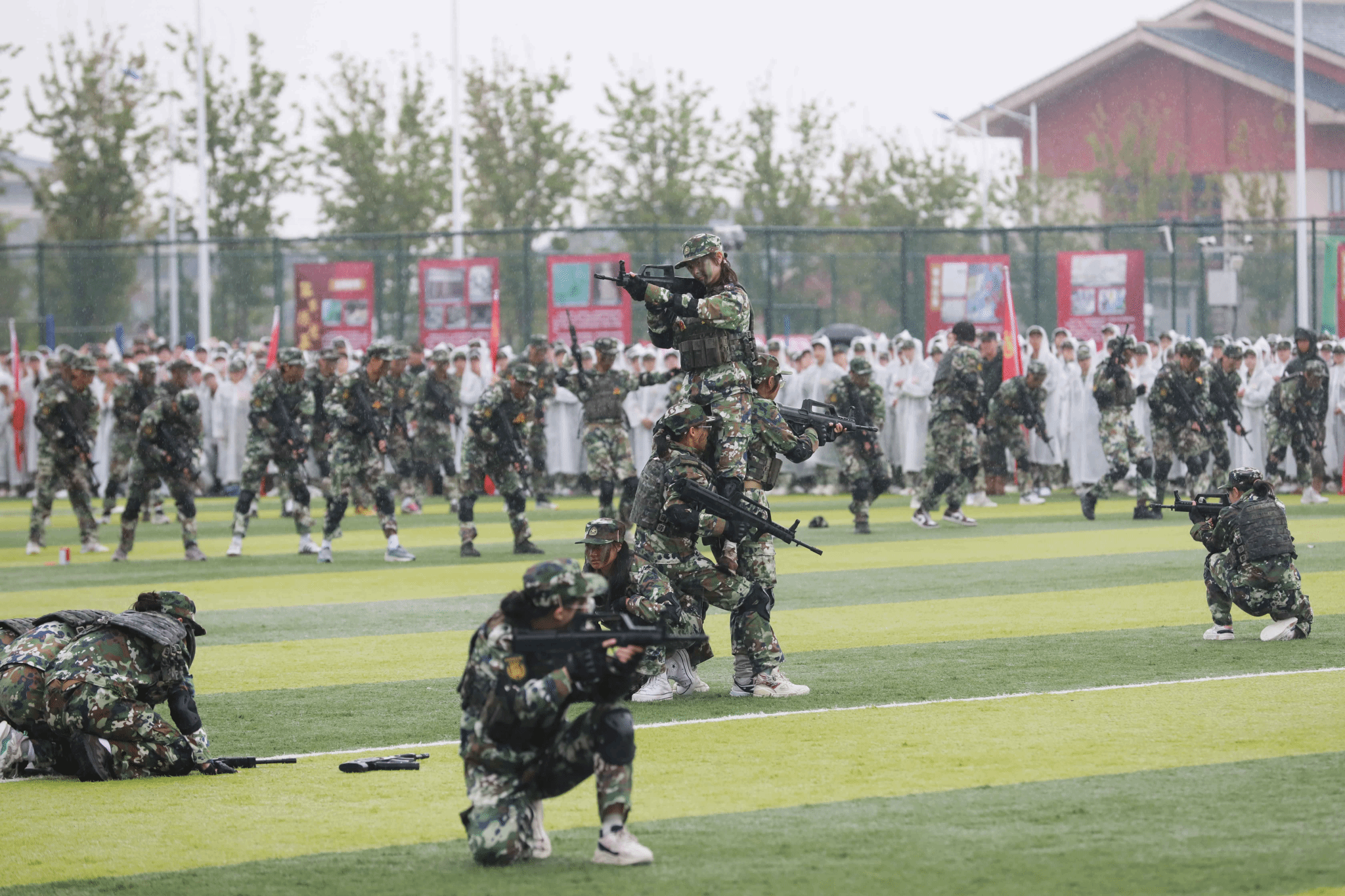 绵绵细雨中,全体参训学生以学院为单位进行了分列式表演。伴随着《分列式进行曲》,20个方阵步伐铿锵、英姿飒爽,自信的目光、整齐的步伐,彰显着青春朝气与坚韧意志。