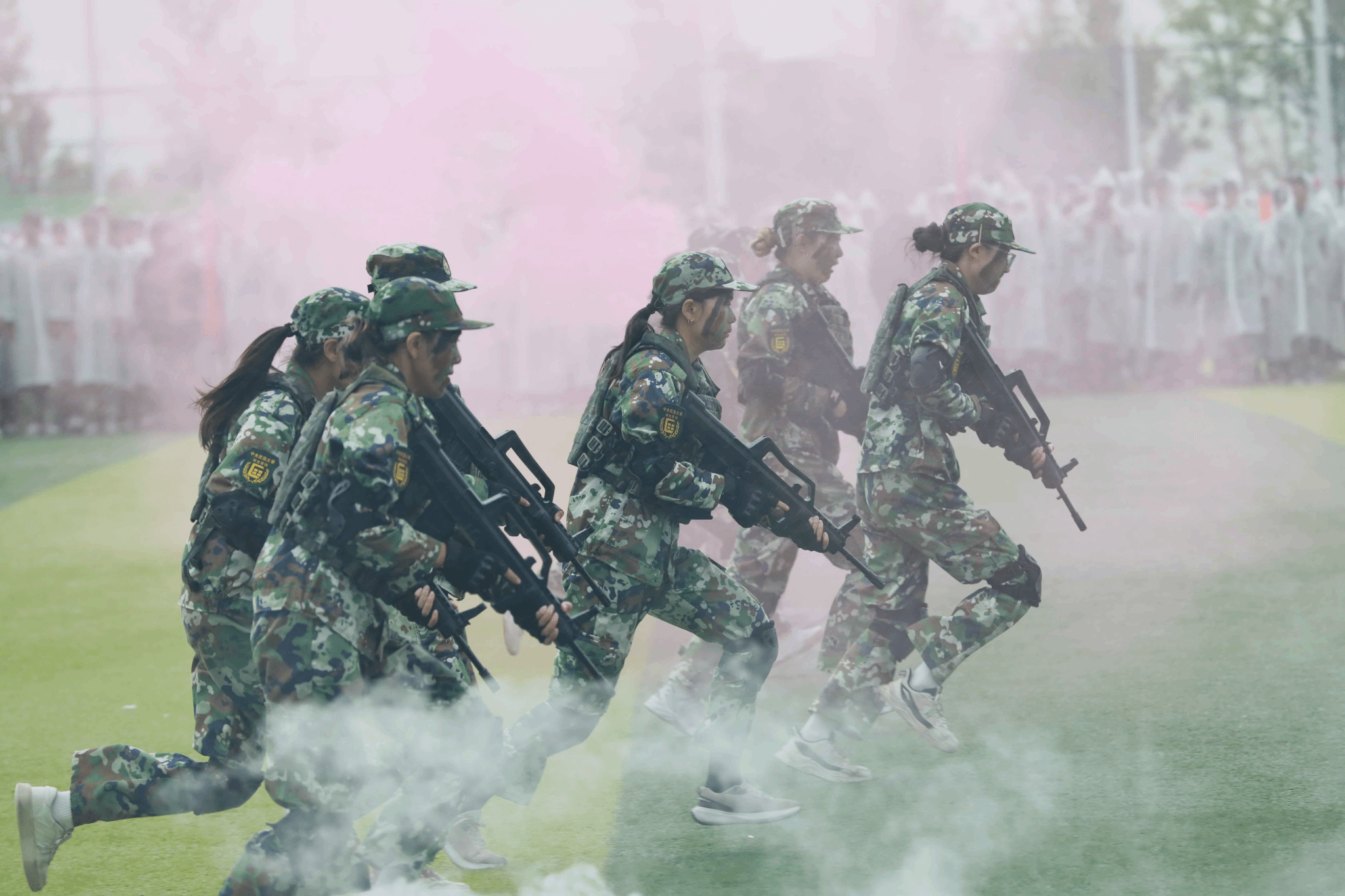 学生特战连进行了擒敌拳、匕首操和战术动作展演。队员们军容严整、斗志昂扬。擒敌拳力道十足,匕首操行云流水,战术动作干脆利落,充分展现了新时代民大学子不畏艰难的意志品质和蓬勃向上的精神风貌,赢得了在场师生的热烈掌声。