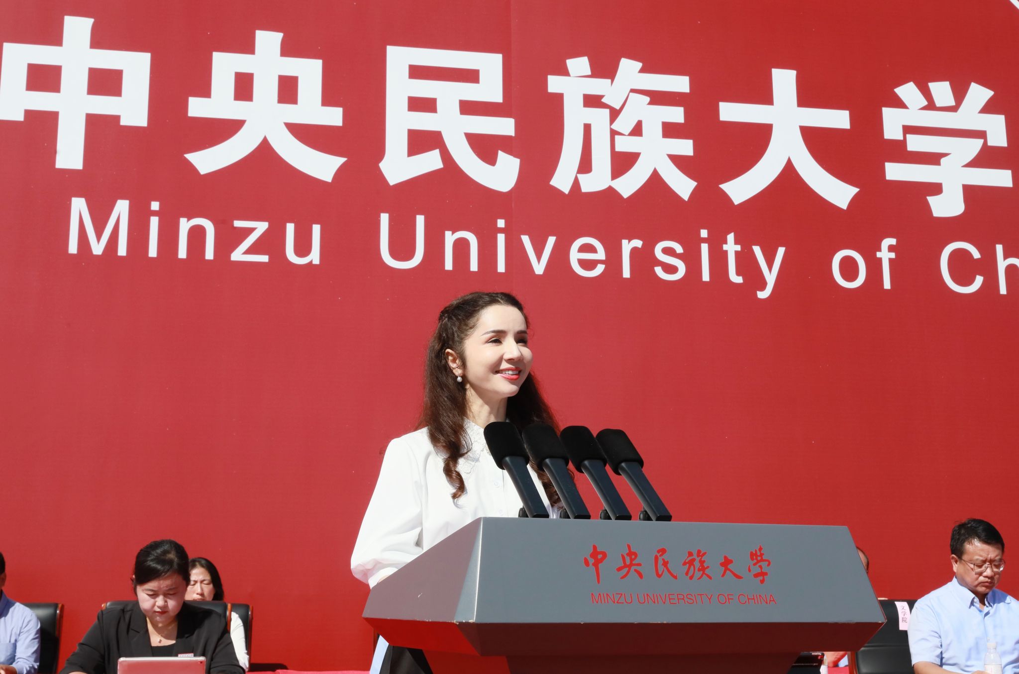 教师代表、舞蹈学院古丽米娜・麦麦提教授围绕学校使命与校训精神,与新同学探讨了成就理想自我等重要课题。她指出,“美美与共”体现在尊重差异、欣赏多元,鼓励新同学在广泛交往、全面交流、深度交融中铸牢中华民族共同体意识;“知行合一”则强调将认知转化为实践,鼓励新同学通过专业学习与通识教育,锤炼真本领、涵养健全人格,不断提升感知美、创造美的能力。
