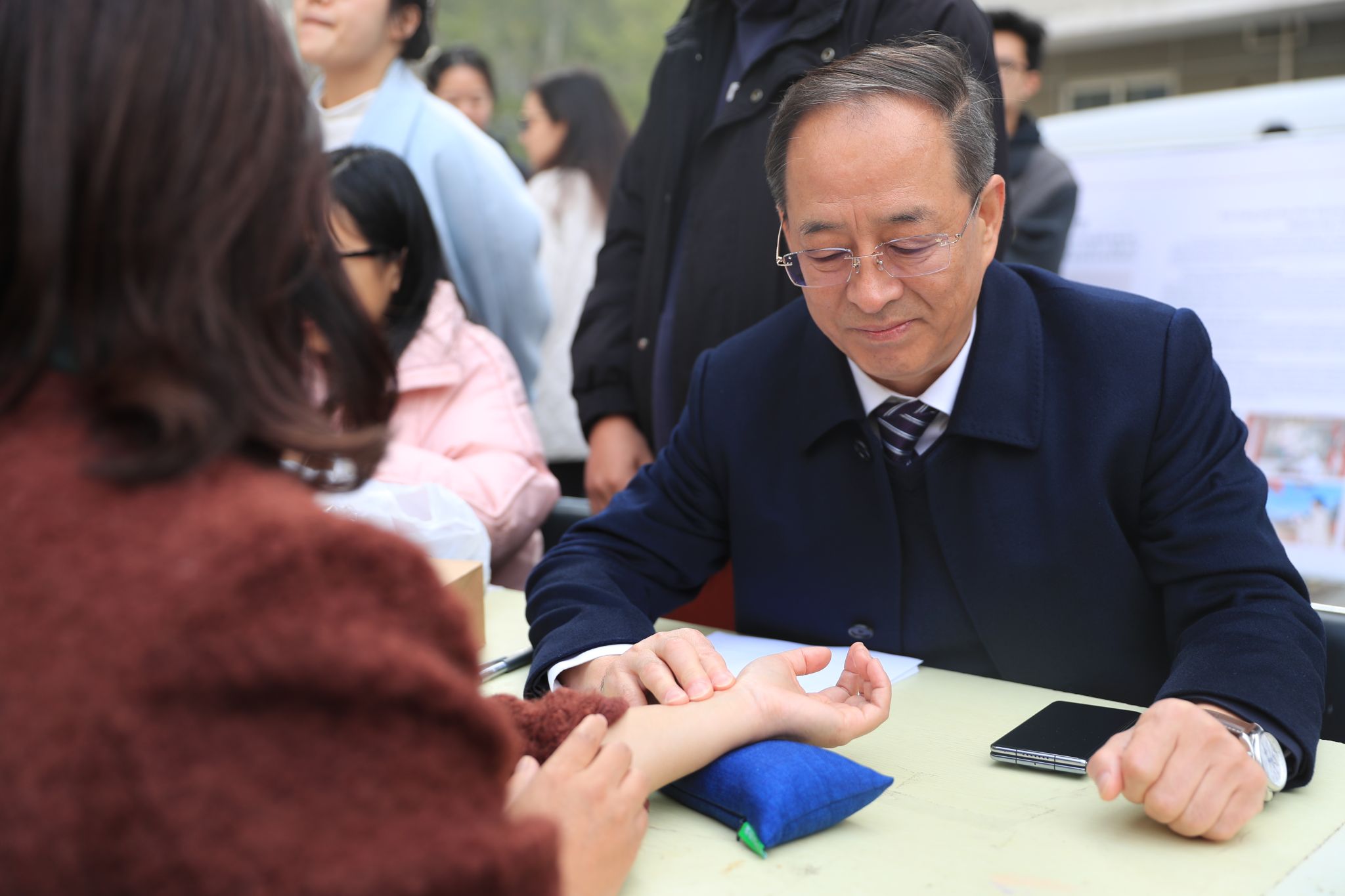 “名医义诊区”内,药学院院长庞宗然为师生诊脉。