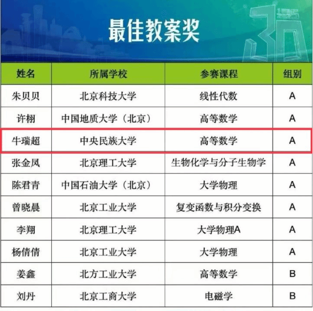 新闻网讯 近日,在北京高校第十四届青年教师教学基本功比赛中理学院教师牛瑞超,以高等数学中《曲面的面积》一节作为参赛内容,荣获理科类一等奖,并荣获“最佳教案奖”与“最佳教学回顾奖”两项单项奖。