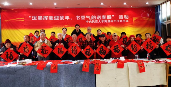 新闻网讯 在鼠年新春佳节来临之际,为弘扬中华传统民俗文化,营造安定、祥和、欢乐的节日气氛,1月16日上午,我校离退休工作处在ag真人试玩离退休教职工活动中心,举办主题为“泼墨挥毫迎鼠年,书香气韵送春联”为我校离退休老同志写春联送祝福活动。校党委常务副书记马文喜,离退休教职工党委书记包永全,离退休工作处处长王华军、副处长刘珂欣、朱涛来到活动现场,与老同志一起共迎新春佳节。