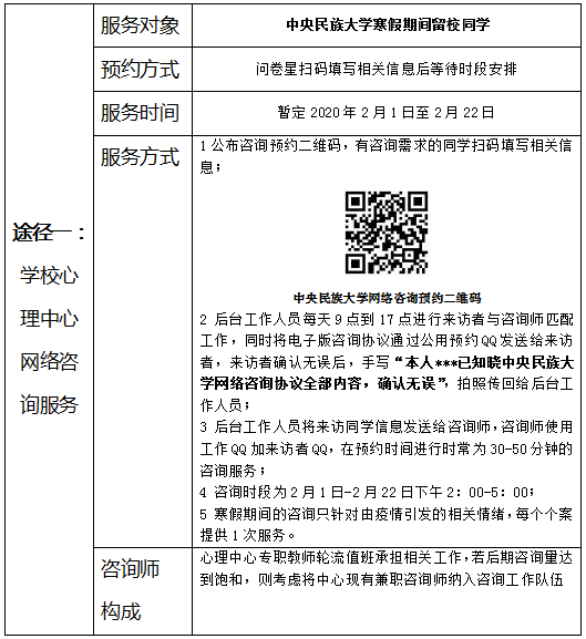 本次干预项目分为两个途径,分别面向2020寒假期间留校同学和我校全体在读同学。凡存在因本次疫情引发情绪、行为等问题的同学,均可根据自身情况,分别寻求这两种途径的心理支持。两种途径均为免费支持途径。