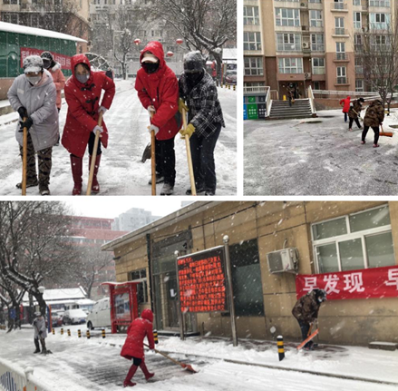 民大社区防控疫情仍在继续,帝都瑞雪带来阵阵寒意,路面被积雪覆盖,这样一群人,手持铲雪锹、大扫帚一步一步铲除积雪薄冰,清扫出一条居民安心回家路。防控岗有一线的“战士”,家门口有义不容辞守护社区环境的人。温暖再次袭来!