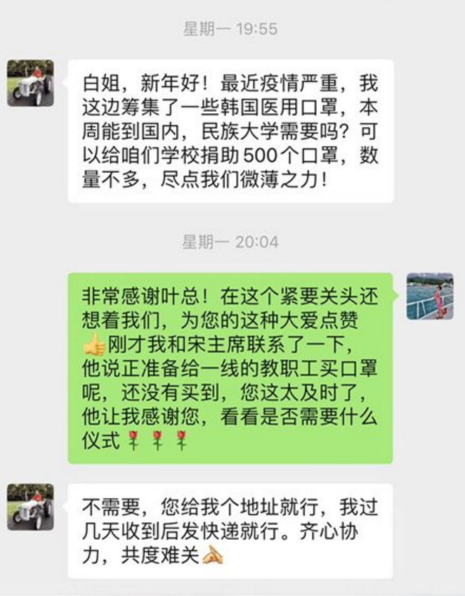 在民大人向社会贡献力量、互帮互助、美美与共的同时,ag视讯还收到了来自广大师生、校友、社区居民及社会爱心人士的关心、关怀。