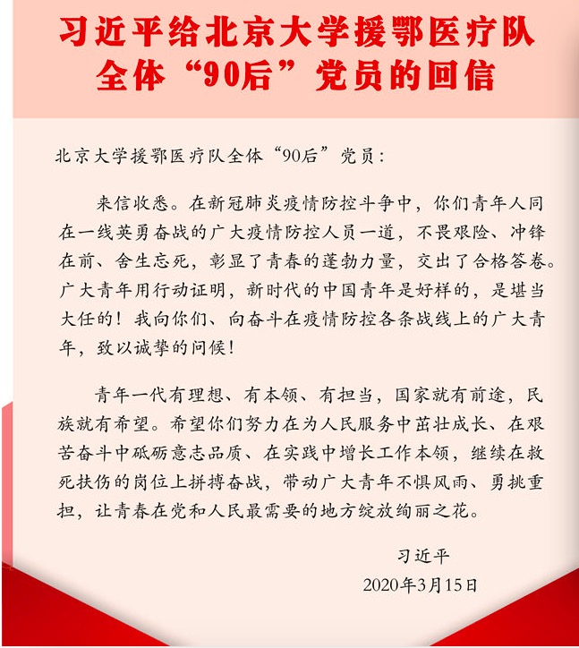 新闻网讯 3月15日,习近平总书记给北京大学援鄂医疗队全体“90后”党员回信,向他们和奋斗在疫情防控各条战线上的广大青年致以诚挚的问候,勉励广大青年不惧风雨、勇挑重担,让青春在党和人民最需要的地方绽放绚丽之花。