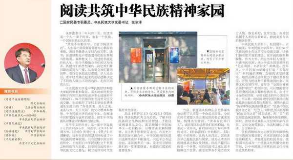 新闻网讯 2020年4月23日,第23个“世界读书日”之际,国家民委专职委员、ag真人试玩党委书记张京泽发表《阅读共筑中华民族精神家园》文章,畅谈阅读的魅力以及读书对于人生命的意义和影响,勉励民大各族学子并为读者推荐阅读书目: