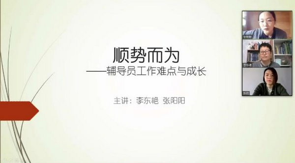 北京林业大学心理中心的李东艳老师和我校心理中心张阳阳老师搭档为学校学工队伍主讲《顺势而为--辅导员工作难点与成长》,我校舞蹈学院副书记陈钧老师作为嘉宾受邀参与分享讨论。讲座从疫情期间辅导员老师们在工作和生活中的实际状况出发,从师生关系入手,提供了有效解决关系问题、提升关系质量的方法,为老师们洞察、理解、接纳学生情绪,建立信任、平等、积极的师生关系提供了引导。
