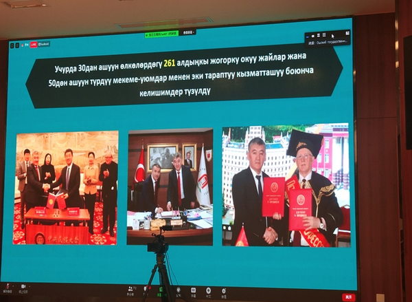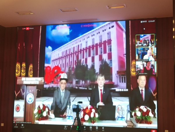 奥什国立大学阔杰别科夫在致谢中表示,感谢宋敏副校长通过视频直播的方式出席校庆活动,希望两校合作建立的人文交流中心,能尽快在疫情结束后开展更多实质性的合作。