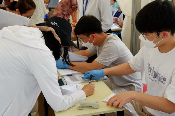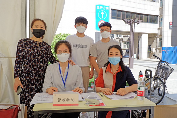 朱馨茹是一名返校的学生志愿者,平时她在图书馆,帮助引导同学们做好图书馆还书等志愿服务工作。今天,她在西门协助返校同学扫码、登记,顺利返校。另一名返校志愿者,管理学院的陈温都苏,觉得自己的志愿者工作比较“简单”,就是审核核酸检查报告、发毕业材料和入住通知单,然后指导学生办理入校手续。