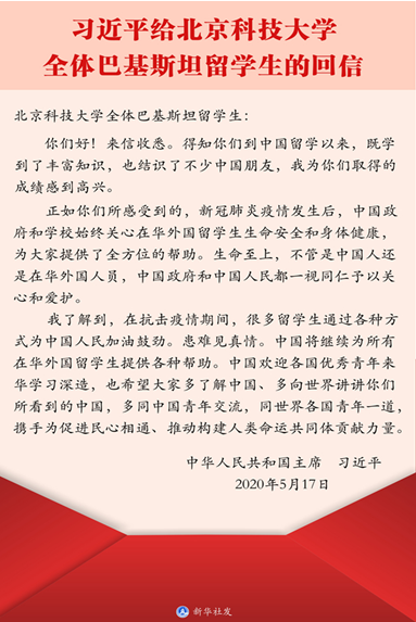 新闻网讯 国家主席习近平5月17日给北京科技大学全体巴基斯坦留学生回信,对各国优秀青年来华学习深造表示欢迎,鼓励他们多同中国青年交流,同世界各国青年一道,携手为促进民心相通、推动构建人类命运共同体贡献力量。