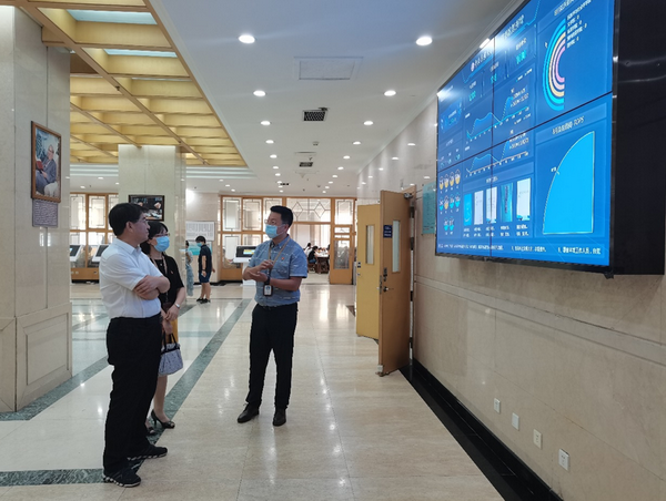 在图书馆一层,张京泽查看了电子屏展示的智慧图书馆数据墙,详细了解了数据墙展示的信息内容,张京泽指出学生返校后充满了学习的热情和读书的渴望,图书馆要继续做好疫情发生以来为线上教学科研提供的支撑保障,为读者提供完备的资源特别是线上资源服务。