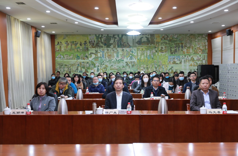 报告会以视频会议形式召开。我校在校校领导,职能部门、教学科研单位主要负责人在中慧楼第一会议室通过视频集体学习。(摄影:马丹妮)
