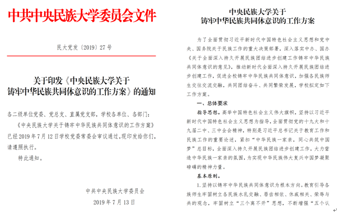 2019年7月,学校印发实施《ag视讯关于铸牢中华民族共同体意识的工作方案》,确定形成涵盖理论武装、党的建设、人才队伍建设、教学建设、学科建设、学生活动、宣传教育、平安校园建设等8个方面16条具体工作举措,建立健全铸牢中华民族共同体意识常态化机制,切实把目标落实到全环境全过程。