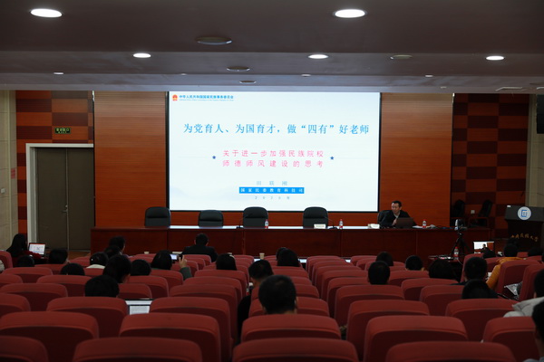 12月7日培训会上,国家民委教育科技司司长田联刚以“为党育人,为国育才,做四有好老师”为题,通过对古今中外师德内涵发展历程的梳理,阐释了新时代师德师风的重要内涵,特别对民族大学的导师提出更高的要求,勉励我校研究生导师要以铸牢中华民族共同体意识为主线,坚守服务中华民族伟大复兴的使命担当,坚持为党育人的初心、为国育才的立场,始终坚持立德树人的根本任务,做到四个相统一,做“四有”好老师,从而为我们落实导师师德师风建设和导师立德树人职责明晰了路径和方向。再帕尔•阿不力孜以“坚守学术道德,树立高尚师德”为题,从如何坚守学术道德,如何提升科研能力、指导能力,团结协作、各尽所能等方面就导师如何培养研究生,树立高尚师德提出了宝贵意见和建议。教育部学位管理与研究生教育司(国务院学位委员会办公室)研究生培养处副处长刘帅从导师指导行为准则出台的意义、核心内涵和具体的落实举措对《研究生导师指导行为准则》进行了细致深入的解读。研究生导师指导行为的“十个不得”为导师的指导行为划定了“红线”,也是导师师德的“高压线”,我们全体导师要认真学习领会,严格按照指导行为准则精心尽力投入指导,不断提高指导水平。