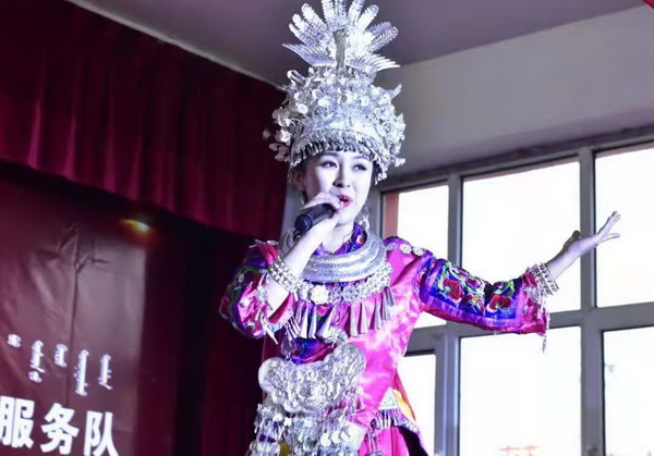 演出现场,文艺志愿者服务队带来了歌曲、口技、魔术等丰富多彩的表演,充分展示了文艺的魅力,展现出乡村振兴中人民群众对美好生活的向往与赞美。我校音乐学院声乐教授、鄂温克族女高音歌唱家乌日娜倾情演唱《唱支山歌给党听》,赢得现场掌声、喝彩声不断。美术学院教授、硕士研究生导师王国能将现场创作的作品赠与土左旗文联留念,用书画把最诚挚的祝福送给村民。