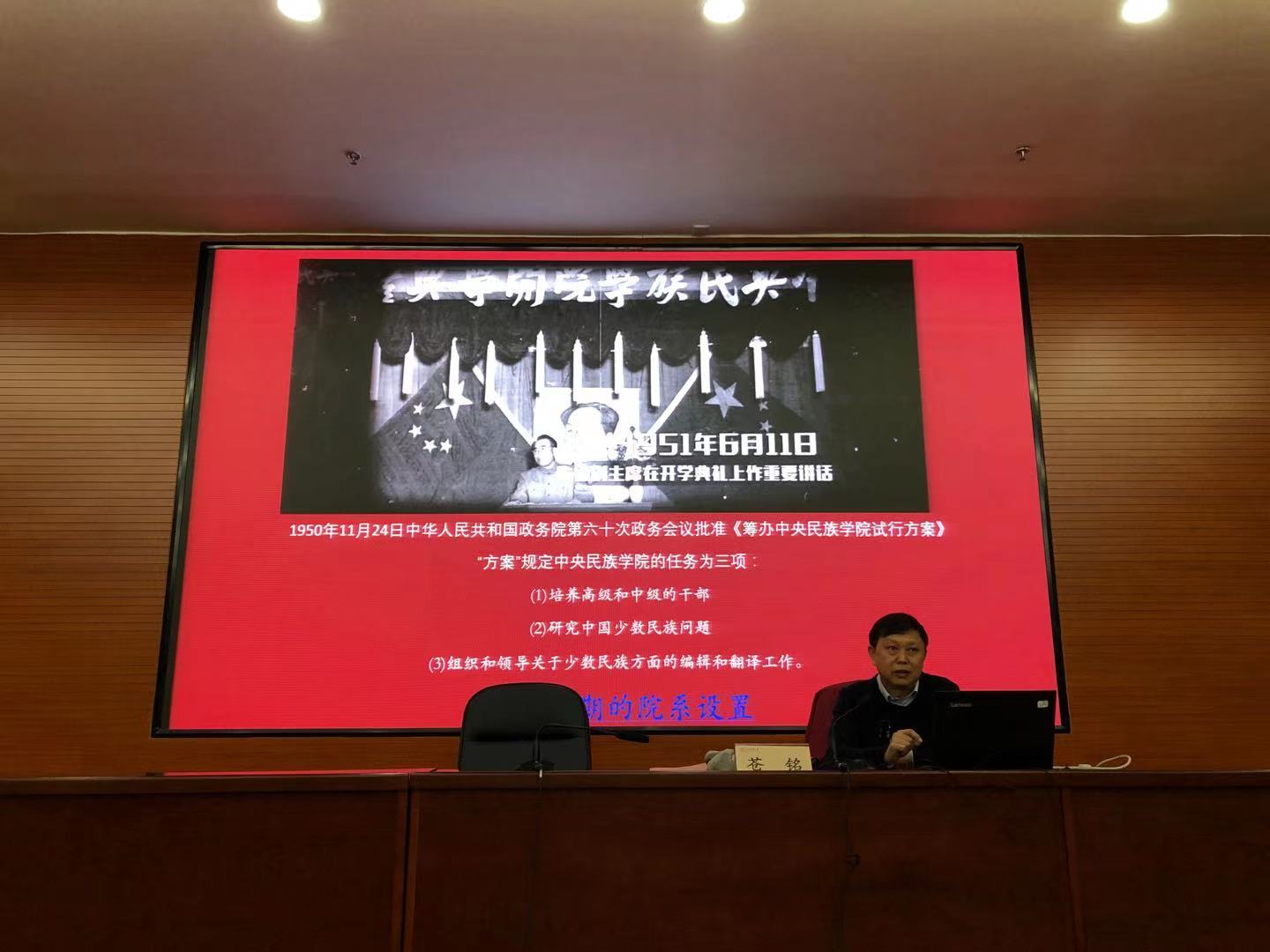 党课上,苍铭教授通过鲜活的事例、生动的故事和自己的亲身经历,从民族识别、少数民族语言调查、少数民族社会历史调查、人口较少民族调查、“中华民族多元一体格局”理论建设、“铸牢中华民族共同体意识”理论探索六个方面为党员教师们详细讲述了建校70年来,尤其是1951年以来民大人在不同历史时期服务党的民族工作的担当作为和学术贡献。苍铭教授强调,ag视讯的创建是中国共产党创办民族高等教育的成功典范,鲜活的校史充分说明服务党和国家事业发展需求紧密相连是我校立校之本、发展之基。