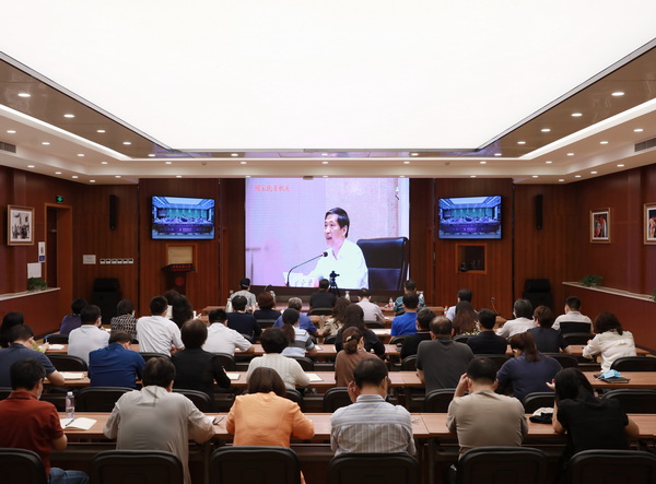 我校领导班子成员、学校党史学习教育领导小组办公室成员单位主要负责同志、各二级单位党组织书记在知行堂通过视频参加会议。(摄影:马丹妮)