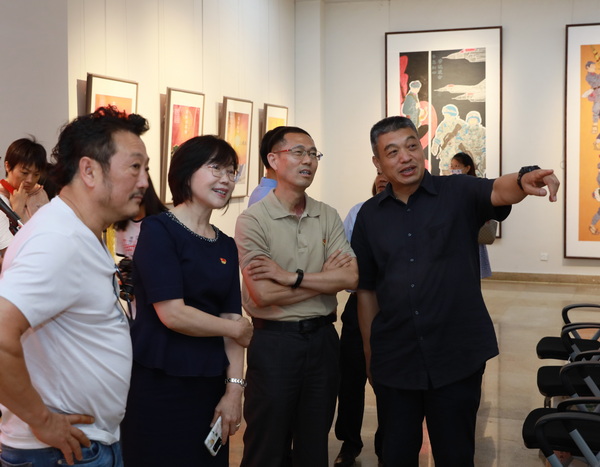 开幕式后,大家在美术学院院长芮法彬等创作者的带领下参观了作品展,并就创作思路主要内容等在现场进行了深入交流。