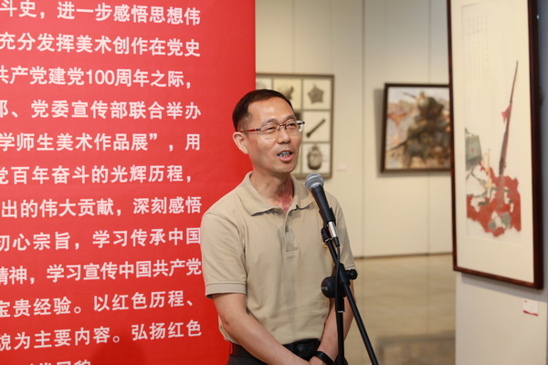 董真祎在致辞中表示,此次师生作品展以画绘党史,追求思想性、艺术性、观赏性的统一,既是一场艺术的盛宴大餐,更是一堂生动的党史大课;是学校党史学习教育“三同六起来”联学联建的一项重要活动和重要成果,更是将党史学习教育与文化育人相结合的一次具体行动。
