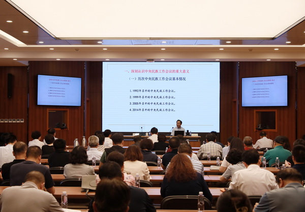 为推动广大干部教师深入学习贯彻习近平新时代中国特色社会主义思想,特别是习近平总书记关于民族工作重要论述,贯彻落实中央民族工作会议精神、推进学校“双一流”建设,9月2日下午,学校邀请中央民族干部学院民族干部教育研究中心主任、“党的民族工作研究与宣讲创新团队”负责人刘宝明教授,为学校第七期新学期干部培训班作铸牢中华民族共同体意识专题辅导报告。本场报告会由校党委副书记邹吉忠主持。