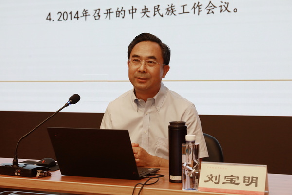 刘宝明以“学习贯彻中央民族工作会议精神,铸牢中华民族共同体意识”为题,从深刻认识中央民族工作会议的重大意义、深刻把握中央民族工作会议提出的新思想新论断新要求、紧紧围绕铸牢中华民族共同体意识目标任务深入贯彻中央民族工作会议精神三个方面,从理论与实践相结合、历史与现实相结合、深刻分析与生动故事相结合的角度,讲述了什么是中华民族共同体意识、为什么要铸牢中华民族共同体意识、铸牢什么样的中华民族共同体意识、怎样铸牢中华民族共同体意识等最基本最重要的问题。