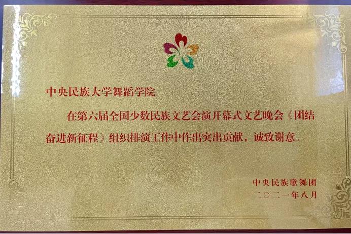 演出结束后,承办单位中央民族歌舞团特意颁发牌匾,对我校舞蹈学院、音乐学院的突出表现致以诚挚感谢。