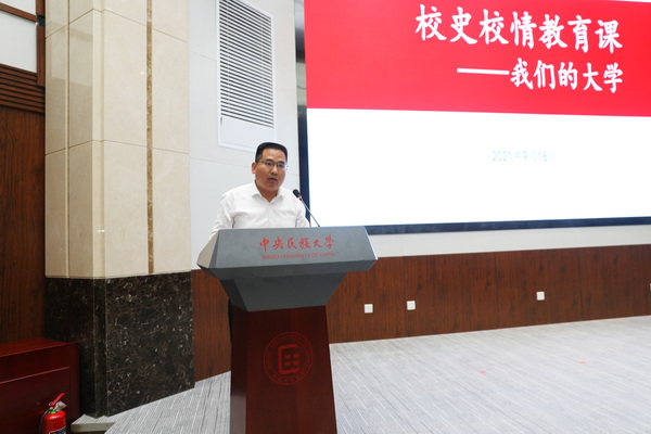 李计勇在主持讲话中亲切地把这场教育课称为51级与21级的对话、“90后”与“00”后的对话,他表示,学校把这堂课精心安排在九•一八事变爆发90周年纪念日,目的就是要教育广大同学勿忘国耻,振兴中华,传承民大红色基因,以实际行动铸牢中华民族共同体意识,成为担当民族复兴大任的时代新人。他对新生提出希望:要知校爱校荣校;要始终保持求真求善求美的力量,科学以求真,人文以求善,艺术以求美;要践行“美美与共”的校训精神。