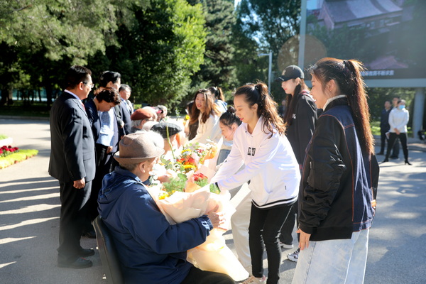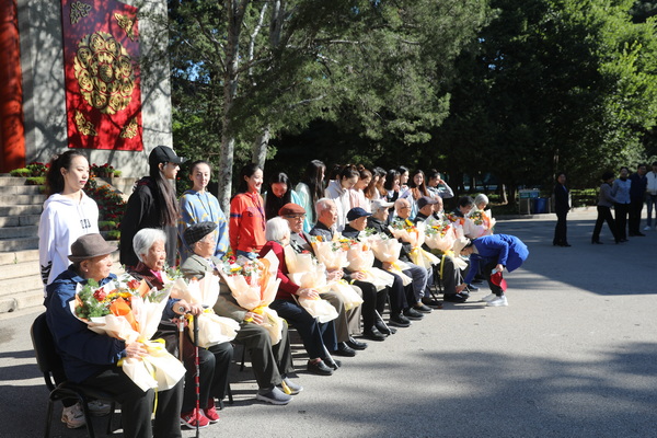 13名2021级新生为年长70岁的“学长”“学姐”们献上鲜花和敬意。“我特别感动!”舞蹈学院2021级学生张雪妍激动地说,“学长”们比我的爷爷奶奶年纪还大,他们为祖国的事业发展奉献了自己的青春,传承了民大的情谊和精神。这些成绩和精神,由像他们一样的20万“民大人”共同创造,我们代代民大学子也必会薪火相传。(摄影:周陈)