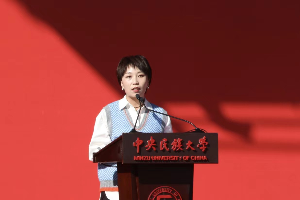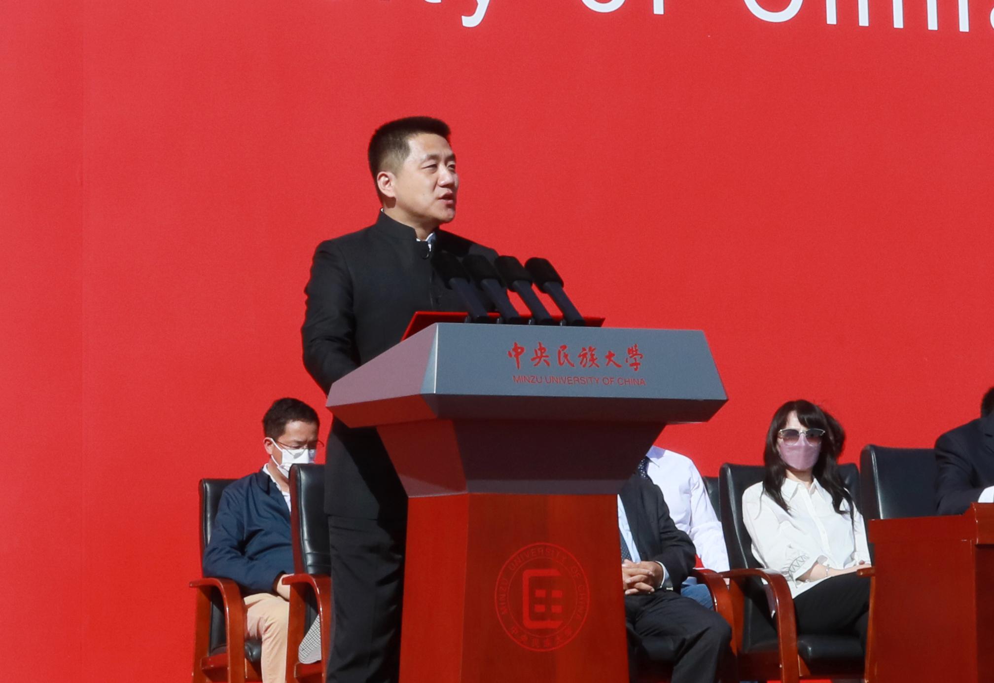 刚刚获得北京市青年教学名师奖荣誉称号的外国语学院石嵩教授作为教师代表,祝愿同学们在民大塑造起以关爱为核心的人文精神、以求真为核心的科学精神、以使命为核心的奋斗精神,“远方有梦想,眼前有阳光,身边有山湖,脚下有土壤。”他勉励同学们秉承“美美与共,知行合一”的校训,在这个全新的起点,开启全新的征程,携手共进,共铸全新的辉煌。