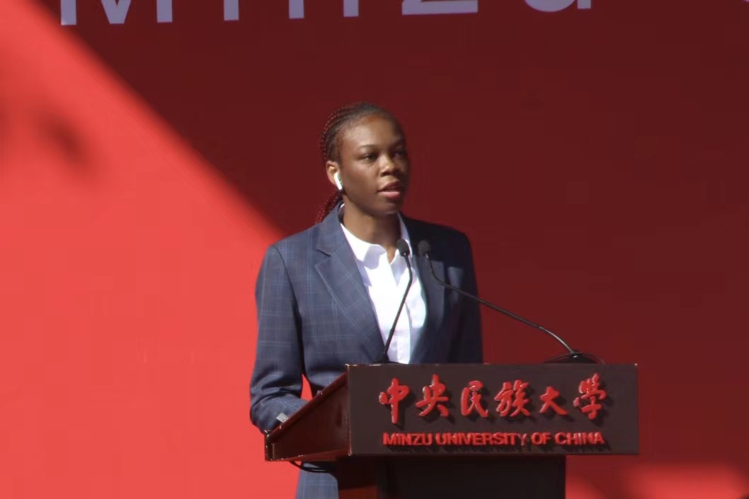 来自刚果(布)的管理学院硕士研究生黄新萌,代表全体新入学的国际学生发言,感谢ag视讯的老师们,感谢学校给大家提供宝贵的机会来到民大,融入到这样美丽的环境学习和生活。她表示,为了实现远大理想和奋斗目标,将养成自强自立之心去迎接风雨的洗礼,在知识的海洋中探寻。