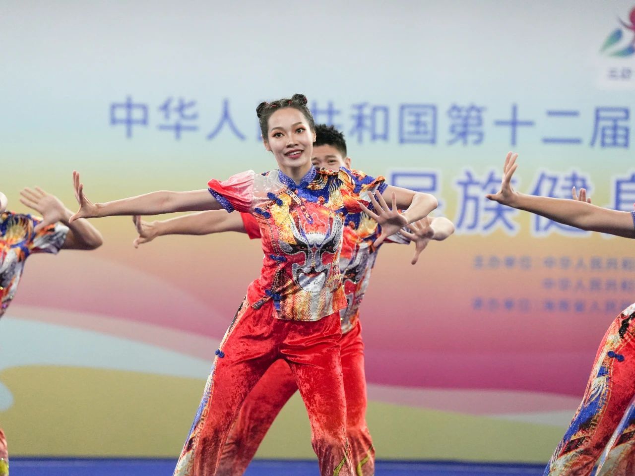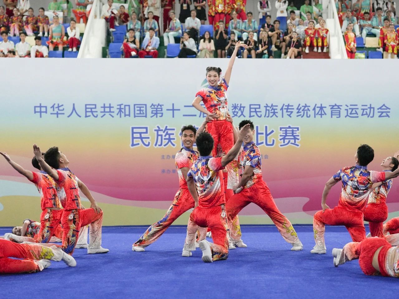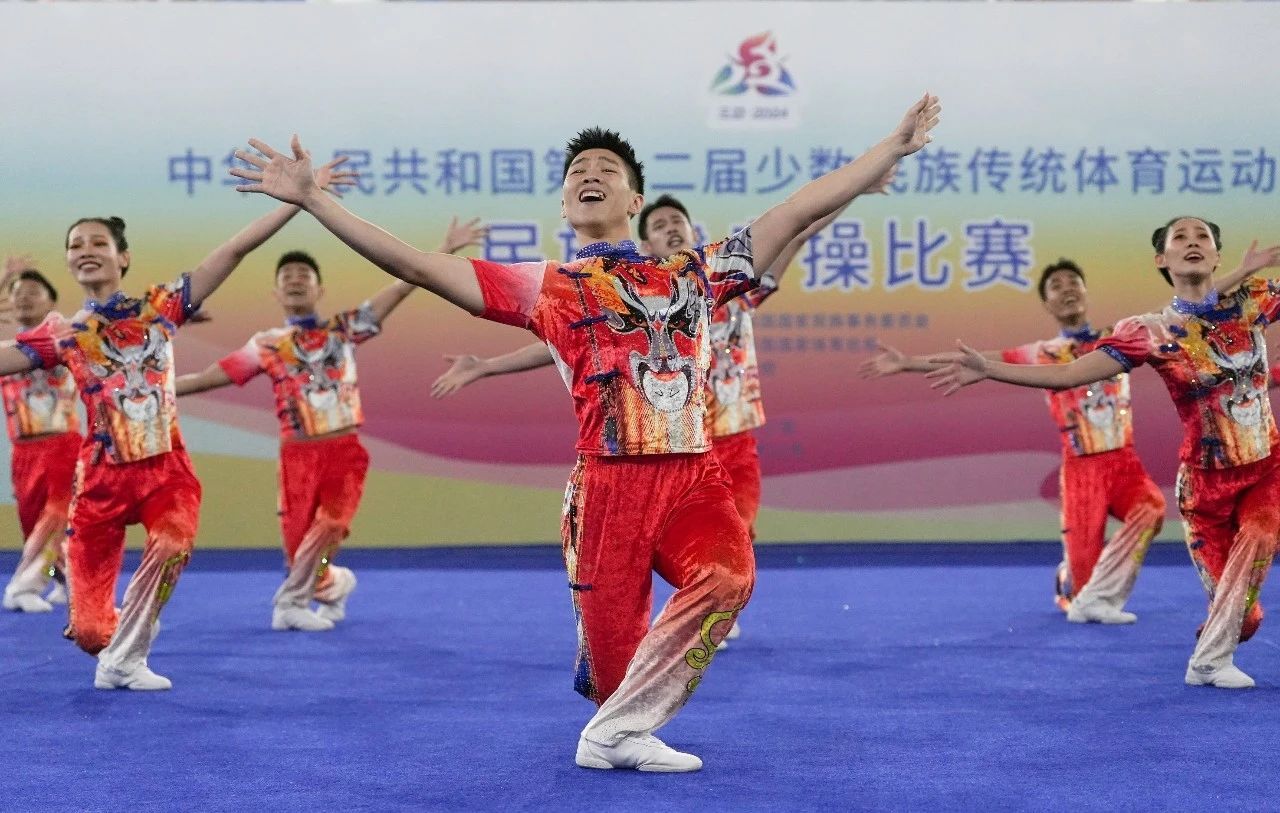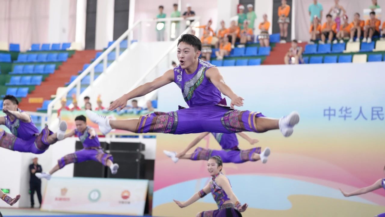 在率先进行的规定套路比赛中,轻松上阵的队员们凭借整齐划一的团队配合、规范到位的动作质量和快乐自信的神采气韵,轮番呈现了20多个民族的特色文化元素,将“锦绣大中华、我们是一家”的精神内涵展现得淋漓极致。最终,队员们两轮成绩均为全场第一,向卫冕三冠之路迈出了坚实的第一步。