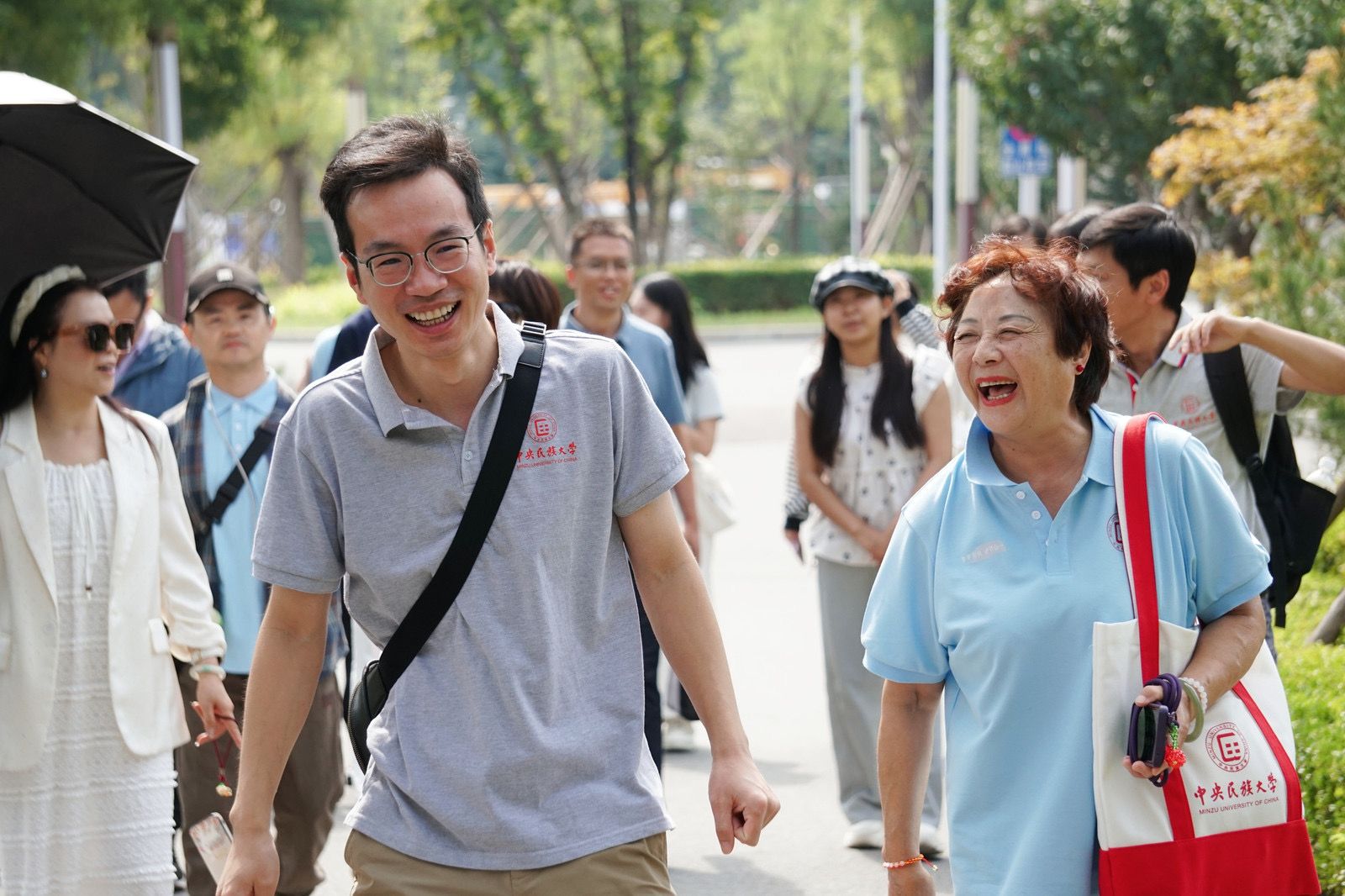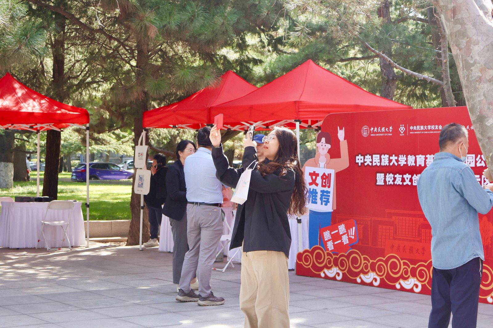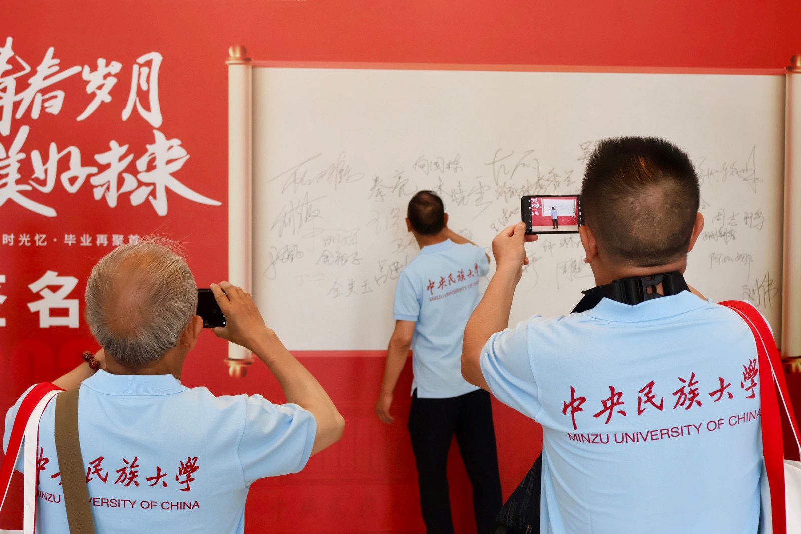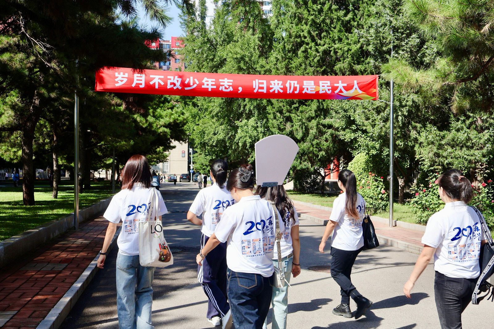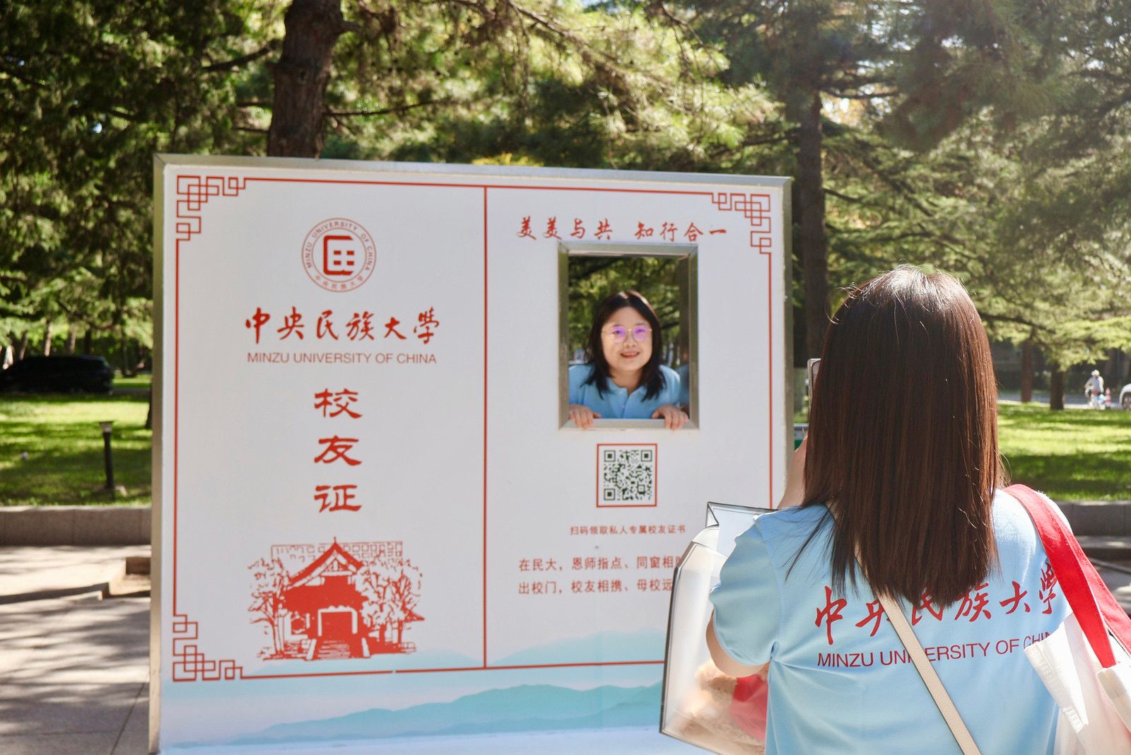 9月的民大校园,因校友们的归来而格外温馨——阔别校园已久的校友们热情相拥,在各个建筑前开心合影,每一帧都在叙说着与民大的情谊。手持校友专属文创纪念品,签名墙上打卡留下名字,这一幕仿佛回到了当年开学的光影。
