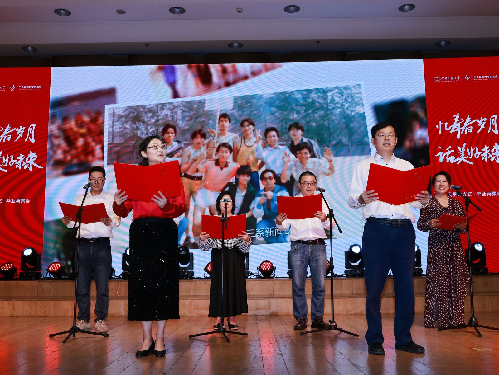 校友代表以《月亮代表我的心》《再见青春》《祝福民大更灿烂》《民大情·时光礼赞》等多首歌曲演唱和诗朗诵,深情诠释着对民大浓浓的思念未曾消失。