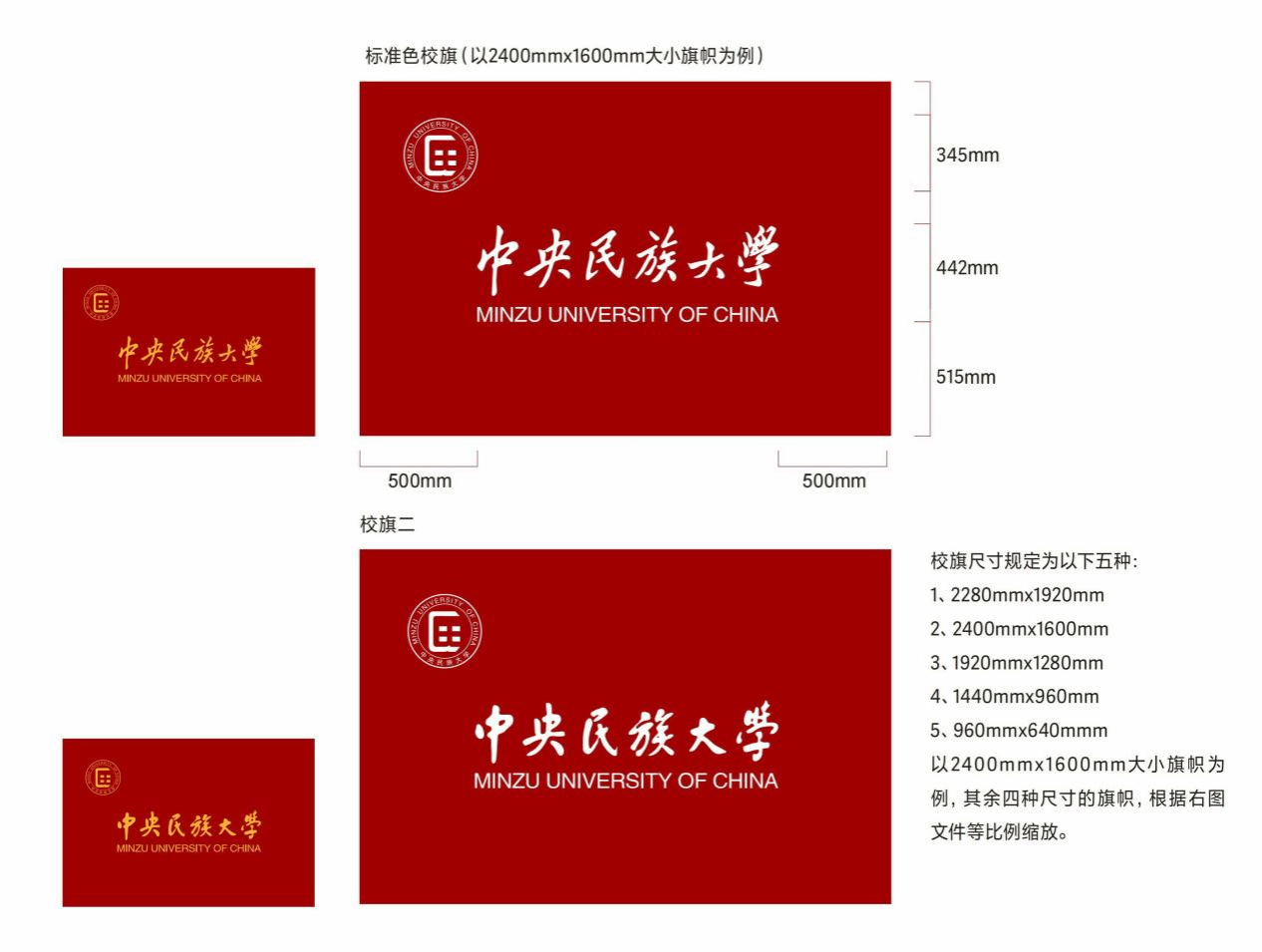 校旗为学校标准色长方形旗帜,校旗上印有学校图形标志与横式中英文标志左右标准组合。左上角印图形标志,中间印学校全名。图案、文字为黄色或反白色。